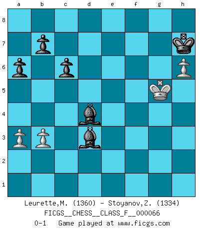 Last move : 0-1 2008 November 4 16:0:48 [Event "FICGS__CHESS__CLASS_F__000066"] [Site "FICGS"] [Date "2008.10.08"] [Round "1"] [White "Leurette,Marc-Antoine"] [Black "Stoyanov,Zdravko"] [Result "0-1"] [WhiteElo "1360"] [BlackElo "1334"] 1.e4 c6 2.d4 d5 3.Nc3 dxe4 4.Nxe4 e6 5.Nf3 Be7 6.Bd3 Nf6 7.O-O h6 8.b3 Nxe4 9.Bxe4 O-O 10.c4 Nd7 11.Bb2 Bf6 12.Qd2 Re8 13.Rad1 a6 14.Ne5 Nxe5 15.dxe5 Qxd2 16.Rxd2 Bg5 17.f4 Bd8 18.Rfd1 Bb6+ 19.Bd4 Ba5 20.Rd3 Bb4 21.Bb6 Kf8 22.Bh7 g6 23.Rh3 h5 24.c5 Kg7 25.Rd4 Ba3 26.Ra4 Bb2 27.Re4 Kxh7 28.g4 Kh6 29.gxh5 gxh5 30.f5 exf5 31.Reh4 Rg8+ 32.Kf2 Rg5 33.Bd8 f4 34.Bxg5+ Kxg5 35.Rxh5+ Kg6 36.Rh6+ Kg7 37.R3h4 Bxe5 38.R6h5 f6 39.Rg4+ Kf7 40.Rh7+ Ke6 41.h4 Kd5 42.Rg8 Bd4+ 43.Kf3 Be5 44.h5 Kxc5 45.h6 Bf5 46.Rhg7 Rxg8 47.Rxg8 Kd5 48.Rg7 Be4+ 49.Kg4 f5+ 50.Kh5 f3 51.Rg1 f4 52.Rd1+ Ke6 53.Rf1 Bd4 54.Re1 Kd5 55.Kg4 f2 56.Rf1 Bd3 57.Rxf2 Bxf2 58.Kxf4 Ke6 59.Kg5 Kf7 60.Kh5 Bd4 61.Kg5 Kg8 62.a3 Kh7 0-1 Caro-Kann defense Kingside Castling by player White (move 7) Kingside Castling by player Black (move 9) 10 pieces endgame at move 58 : White KPPP , Black KBBPPP WHITE : King + 3 Pawns BLACK : King + 2 Bishops 3 Pawns Player Black won this chess game. Follow this game move after move (download)You have to have the fighting spirit. You have to force moves and take chances. (Bobby Fischer) Ein Isolani verdüstert die Stimmung auf dem ganzen Schachbrett. (Savielly Grigorievitsch Tartakower) Cuando veas una buena jugada, trata de encontrar otra mejor. (Emanuel Lasker) Dans le domaine de la peinture, de la gravure et de la sculpture, dès la première décennie de notre siècle, les artistes abandonnent la représentation de la partie d'échecs pour se concentrer sur les pièces, sur les échiquiers et sur toutes les variations auxquelles les unes et les autres peuvent donner lieu. On passe en quelque sorte d'un thème social à un thème musical (au sens de la musica médiévale, c'est-à-dire d'une notion qui inclue le rythme, l'harmonie, la construction et la déconstruction, etc.). Graphiquement et picturalement, l'échiquier apparaît comme une structure ouverte, dynamique, d'une richesse infinie, autorisant toutes les combinatoires et débouchant sur des mouvements et des rythmes de nature exponentielle. (Michel Pastoureau) Creativity is inventing, experimenting, growing, taking risks, breaking rules, making mistakes, and having fun. (Mary Lou Cook)