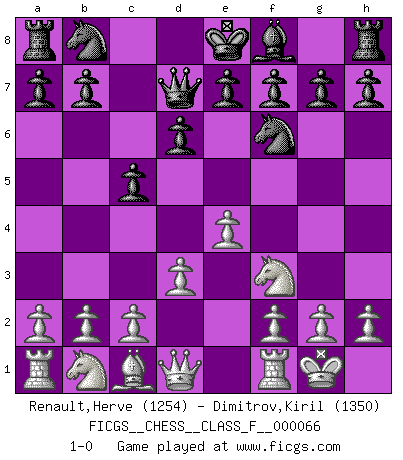 Last move : 1-0 2008 November 25 9:57:13 [Event "FICGS__CHESS__CLASS_F__000066"] [Site "FICGS"] [Date "2008.10.08"] [Round "1"] [White "Renault,Herve"] [Black "Dimitrov,Kiril"] [Result "1-0"] [WhiteElo "1254"] [BlackElo "1350"] 1.e4 c5 2.Nf3 d6 3.Bb5+ Bd7 4.Bxd7+ Qxd7 5.O-O Nf6 6.d3 1-0 This chess game has been lost on time (started : 2008.10.08 15:47:30) Sicilian : Canal-Sokolsky attack, 3...Bd7 Kingside Castling by player White (move 5) Player White won this chess game. Follow this game move after move (download)Good positions don't win games, good moves do. (Gerald Abrahams) Ein guter Spieler hat immer Glück. (José Raúl Capablanca) No volvere nunca a jugar contigo. Has insultado a mi amigo. - cuando un oponente se maldijo por una mala jugada (Miguel Najdorf) Je crois qu'il existe des manières très spécifiques de jouer efficacement contre une machine. Evidemment, nous n'avons aucune chance en technique pure, parce que l'ordinateur calcule de manière parfaite. Mais lorsque nous faisons appel à notre cerveau, en utilisant l'intuition et la compréhension, alors nous restons beaucoup plus forts. (Anatoli Karpov) If only people were all showed a certain minimum level of niceness; if only people didn't retract verbal draw offers (without draw box ticked) on ficgs; if only people didn't kill; if only people didn't run concentration / extermination camps, if only people didn't drop nuclear bombs on Hiroshima and Nagasaki, and so on - it would be a much more beautiful world. But sadly, things are not so... (Normajean Yates)