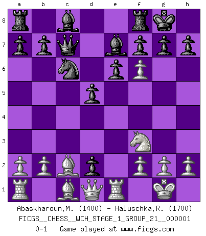 Last move : 0-1 2006 October 22 7:19:51 [Event "FICGS__CHESS__WCH_STAGE_1_GROUP_21__000001"] [Site "FICGS"] [Date "2006.08.12"] [Round "1"] [White "Abaskharoun,Mena"] [Black "Haluschka,Rainer"] [Result "0-1"] [WhiteElo "1400"] [BlackElo "1700"] 1.e4 c5 2.Nf3 d6 3.c3 e6 4.Bd3 Nf6 5.Bc2 Be7 6.O-O O-O 7.Re1 Nc6 8.d3 Qc7 9.Nbd2 d5 10.d4 cxd4 11.e5 dxc3 12.exf6 cxd2 0-1 This chess game has been lost on time (started : 2006.08.12 20:33:23) Sicilian Kingside Castling by player White (move 6) Kingside Castling by player Black (move 6) Player Black won this chess game. Follow this game move after move (download)It is always better to sacrifice your opponent's men. (Savielly Tartakower) Obwohl ich alt bin, darf mir niemand den Finger in den Mund stecken, sonst beisse ich. (Wilhelm Steinitz) El Ajedrez hace al hombre ser mas sabio y ver mas claro. (Vladimir Putin) Même un GMI sait rarement calculer sur plus de cinq coups une attaque à sacrifices. (Rudolf Spielmann) Luck is when opportunity knocks and you answer. (Anonymous)