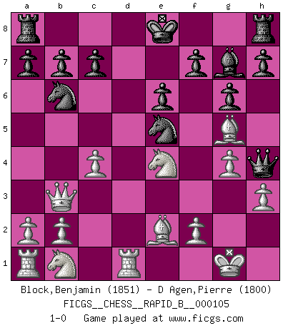 Last move : 1-0 2008 November 20 17:14:1 [Event "FICGS__CHESS__RAPID_B__000105"] [Site "FICGS"] [Date "2008.10.09"] [Round "1"] [White "Block,Benjamin"] [Black "D Agen,Pierre"] [Result "1-0"] [WhiteElo "1851"] [BlackElo "1800"] 1.e4 Nf6 2.e5 Nd5 3.d4 d6 4.Nf3 Bg4 5.Be2 Nd7 6.O-O g6 7.h3 Bf5 8.g4 Be4 9.Ng5 dxe5 10.Nxe4 Bg7 11.dxe5 Nxe5 12.c4 Nb6 13.Qb3 e6 14.Rd1 Qh4 15.Bg5 1-0 Alekhine's defense : Modern variation, 4...Bg4 Kingside Castling by player White (move 6) Player White won this chess game. Follow this game move after move (download)If cunning alone were needed to excel, women would be the best Chess players. (Albin) Zeige mir drei Eröffnungsvarianten und ich beweise dir, dass zwei davon inkorrekt sind. (Emanuel Lasker) Puntos débiles o agujeros en la posición de tu oponente deben de ser ocupados por piezas, no Peones. (Siegbert Tarrasch) La vie et les Echecs sont tous les deux une lutte constante. (Lasker) Internet: Absolute communication, absolute isolation. (Paul Carvel)
