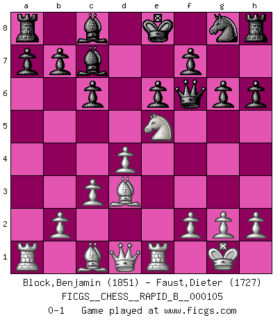 Last move : 0-1 2009 February 9 20:54:10 [Event "FICGS__CHESS__RAPID_B__000105"] [Site "FICGS"] [Date "2008.10.09"] [Round "1"] [White "Block,Benjamin"] [Black "Faust,Dieter"] [Result "0-1"] [WhiteElo "1851"] [BlackElo "1727"] 1.e4 e6 2.d4 d5 3.Nd2 Be7 4.Bd3 Nc6 5.Ngf3 Nb4 6.Be2 dxe4 7.Nxe4 Qd5 8.a3 Qxe4 9.axb4 Bxb4+ 10.c3 Bd6 11.Ra5 h6 12.O-O Qg6 13.Bd3 Qf6 14.Ne5 c6 15.Re1 Bc7 16.Ra1 g6 17.Ng4 Qd8 18.Ne5 Qf6 0-1 This chess game has been lost on time (started : 2008.10.09 21:25:5) French : Tarrasch Kingside Castling by player White (move 12) Player Black won this chess game. Follow this game move after move (download)The tactician knows what to do when there is something to do; whereas the strategian knows what to do when there is nothing to do. (Gerald Abrahams) Das Schachspiel übertrifft alle anderen Spiele so weit wie der Chimborasso einen Misthaufen. (Arthur Schopenhauer) Un sacrificio se refuta mucho mejor al aceptarlo. (Wilhelm Steinitz) Les Echecs ont trois composantes : le temps, l'espace et le matériel en dernier. (Mikhail Tal) There's always a bigger fish. (Qui-Gon Jinn in Star Wars ep.1)