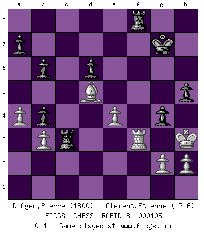 Last move : 0-1 2008 December 4 9:48:19 [Event "FICGS__CHESS__RAPID_B__000105"] [Site "FICGS"] [Date "2008.10.09"] [Round "1"] [White "D Agen,Pierre"] [Black "Clement,Etienne"] [Result "0-1"] [WhiteElo "1800"] [BlackElo "1716"] 1.d4 Nf6 2.c4 g6 3.Nc3 Bg7 4.e4 d6 5.Bd3 O-O 6.f4 c5 7.d5 e6 8.Nf3 exd5 9.cxd5 Re8 10.O-O Bg4 11.Qb3 Bxf3 12.Rxf3 Qc7 13.Bd2 Nbd7 14.Re1 Nb6 15.Bb1 Ng4 16.f5 Bd4+ 17.Be3 Nxe3 18.R1xe3 Bxe3+ 19.Rxe3 Qe7 20.a4 Qg5 21.Nd1 Rab8 22.Nf2 Nxd5 23.Rg3 Qc1+ 24.Qd1 Qxd1+ 25.Nxd1 Nf4 26.Rg4 Ne2+ 27.Kf2 Nd4 28.fxg6 fxg6 29.Nc3 Rf8+ 30.Ke3 Rbe8 31.Ba2+ Kg7 32.Nd5 Nc2+ 33.Ke2 Nb4 34.Nxb4 cxb4 35.Bd5 Re7 36.Rg3 Rc8 37.Kd2 b6 38.b3 Rec7 39.Ke3 Rc3+ 40.Kf4 Rf8+ 41.Kg4 h5+ 42.Kh3 g5 43.Rf3 g4+ 0-1 King's Indian : 4.e4 Kingside Castling by player Black (move 5) Kingside Castling by player White (move 10) Player Black won this chess game. Follow this game move after move (download)Chess is like life. (Boris Spassky) Schach ist ein Teil der Kultur, und wenn es mit der Kultur abwärts geht, geht es auch mit dem Schach abwärts. (Mikhail Moiseyevich Botvinik) El Ajedrez moderno está demasiado preocupado con cosas como la estructura de Peones. Olvidenlo, el Jaque Mate termina la partida. (Nigel Short) Nous sommes les pions de la mystérieuse partie d'Echecs jouée par Dieu. Il nous déplace, nous arrête, nous pousse encore, puis nous lance un à un dans la boîte du Néant. Epitaphe sur la tombe de David Janowsky (1868-1927). To err is human, but to really foul things up requires a computer. (Farmer's Almanac, 1978)