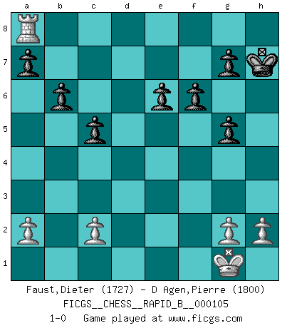 Last move : 1-0 2008 December 3 10:56:45 [Event "FICGS__CHESS__RAPID_B__000105"] [Site "FICGS"] [Date "2008.10.09"] [Round "1"] [White "Faust,Dieter"] [Black "D Agen,Pierre"] [Result "1-0"] [WhiteElo "1727"] [BlackElo "1800"] 1.e4 Nf6 2.e5 Nd5 3.Nc3 Nxc3 4.bxc3 d6 5.f4 Nc6 6.Nf3 Bg4 7.d4 dxe5 8.fxe5 e6 9.Bd3 Be7 10.O-O O-O 11.Qe1 Bxf3 12.Rxf3 Nxd4 13.cxd4 Qxd4+ 14.Be3 Qxe5 15.Rb1 b6 16.Rh3 h6 17.Qd2 Bg5 18.Bxg5 Qxg5 19.Qxg5 hxg5 20.Bh7+ Kh8 21.Be4 Kg8 22.Bxa8 Rxa8 23.Rd1 f6 24.Rhd3 c5 25.Rd8+ Rxd8 26.Rxd8+ Kh7 27.Ra8 1-0 Alekhine's defense : Saemisch attack Kingside Castling by player White (move 10) Kingside Castling by player Black (move 10) Player White won this chess game. Follow this game move after move (download)Many Chess players were surprised when after the game, Fischer quietly explained: 'I had already analyzed this possibility' in a position which I thought was not possible to foresee from the opening. (Mikhail Tal) Ohne Leiden bildet sich kein Charakter. (Ernst Freiherr von Feuchtersleben) Yo siempre he tenido un ligero sentimiento de lástima por una persona que no tiene conocimiento del Ajedrez. (Siegbert Tarrasch) Je crois qu'il existe des manières très spécifiques de jouer efficacement contre une machine. Evidemment, nous n'avons aucune chance en technique pure, parce que l'ordinateur calcule de manière parfaite. Mais lorsque nous faisons appel à notre cerveau, en utilisant l'intuition et la compréhension, alors nous restons beaucoup plus forts. (Anatoli Karpov) My poor ole parrot... Is not in the circulation of displays ....poo hoo hoo :) (Wayne Lowrance's enigma)