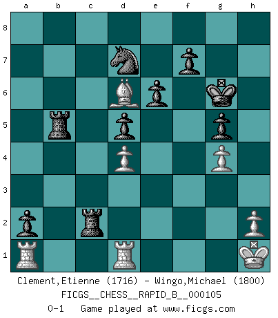 Last move : 0-1 2009 January 4 22:52:7 [Event "FICGS__CHESS__RAPID_B__000105"] [Site "FICGS"] [Date "2008.10.09"] [Round "1"] [White "Clement,Etienne"] [Black "Wingo,Michael"] [Result "0-1"] [WhiteElo "1716"] [BlackElo "1800"] 1.e4 e6 2.d4 d5 3.e5 c5 4.c3 Qb6 5.Nf3 Nc6 6.Qb3 Qxb3 7.axb3 cxd4 8.cxd4 Bd7 9.Bb5 Nxe5 10.Bxd7+ Nxd7 11.Nc3 Bb4 12.O-O Ke7 13.Re1 Ngf6 14.Ra4 a5 15.Bg5 Bxc3 16.bxc3 Rhc8 17.Re3 b5 18.Ra1 a4 19.Nd2 a3 20.Ra2 b4 21.cxb4 Rc1+ 22.Nf1 Rb1 23.b5 Rb2 24.Ra1 a2 25.R3e1 h6 26.Bh4 g5 27.Bg3 Ne4 28.f3 Nc3 29.Ne3 Kf6 30.Nd1 Nxd1 31.Rexd1 Rc8 32.f4 R8c2 33.Kh1 Rxb3 34.fxg5+ hxg5 35.Bd6 Rxb5 36.g4 Kg6 0-1 French : Advance variation Kingside Castling by player White (move 12) Player Black won this chess game. Follow this game move after move (download)Let the perfectionist play postal. (Yasser Seirawan) Wenn Capablanka heute auf der Schachbühne erscheinen würde, hätte er ein halbes Jahr gebraucht um sich die Schachtheorie anzueignen. Und dann hätte er alles und jeden besiegt. (Mikhail Moiseyevich Botvinik) Peones: ellos son el alma de esta partida, solos forman el ataque y la defensa. (Philidor) Aidez vos pièces, elles vous aideront. (Paul Morphy) A good programmer is someone who always looks both ways before crossing a one-way street. (Doug Linder)