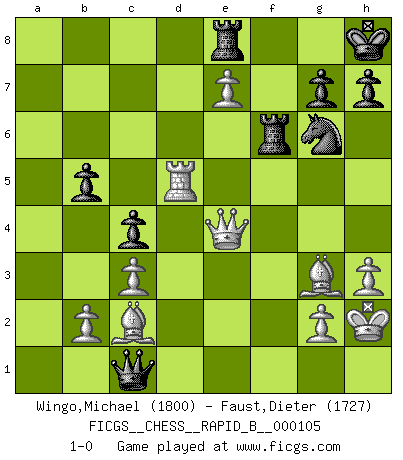 Last move : 1-0 2009 January 9 10:3:44 [Event "FICGS__CHESS__RAPID_B__000105"] [Site "FICGS"] [Date "2008.10.09"] [Round "1"] [White "Wingo,Michael"] [Black "Faust,Dieter"] [Result "1-0"] [WhiteElo "1800"] [BlackElo "1727"] 1.d4 e6 2.Nf3 Nf6 3.e3 d5 4.Bd3 c5 5.c3 c4 6.Bc2 Bd6 7.Nbd2 Qc7 8.Qe2 O-O 9.e4 e5 10.dxe5 Bxe5 11.Nxe5 Qxe5 12.Nf3 Qc7 13.e5 Re8 14.h3 Nc6 15.Bf4 Nd7 16.O-O Nf8 17.Rfd1 Be6 18.Bg3 Qe7 19.Nd4 f6 20.f4 fxe5 21.fxe5 Qg5 22.Kh2 Nxd4 23.Rxd4 Ng6 24.Rad1 Rf8 25.Rxd5 Bxd5 26.Rxd5 Rac8 27.Rd7 b5 28.Qe4 a6 29.a4 Rce8 30.axb5 axb5 31.Rd1 Kh8 32.e6 Rf6 33.Rd5 Qc1 34.e7 1-0 Queen's pawn Kingside Castling by player Black (move 8) Kingside Castling by player White (move 16) Player White won this chess game. Follow this game move after move (download)Whoever sees no other aim in the game than that of giving checkmate to one's opponent will never become a good Chess player. (Euwe) Ich liebe den Moment, wenn ich das Ego meines Gegenüber breche. (Robert James Fischer) En el tablero, la mentira e hipocresÃa no sobreviven mucho. (Emanuel Lasker) Que feriez-vous si vous étiez en train de jouer aux échecs et que la fin du monde arrive ? Je continuerais à jouer. (Saint Borromée) Empty your mind, be formless, shapeless — like water. (Bruce Lee)
