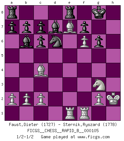 Last move : 1/2-1/2 2008 October 30 7:44:13 [Event "FICGS__CHESS__RAPID_B__000105"] [Site "FICGS"] [Date "2008.10.09"] [Round "1"] [White "Faust,Dieter"] [Black "Sternik,Ryszard"] [Result "1/2-1/2"] [WhiteElo "1727"] [BlackElo "1778"] 1.e4 e5 2.Nf3 Nc6 3.d4 exd4 4.Nxd4 Bc5 5.Nxc6 Qf6 6.Qd2 dxc6 7.Nc3 Bd4 8.Bd3 Ne7 9.O-O Ng6 10.Kh1 Ne5 11.f4 Ng4 12.h3 Qh4 13.Ne2 Nf2+ 14.Kh2 Bc5 15.f5 O-O 16.Qg5 Qxg5 17.Bxg5 Re8 18.Rae1 Nxe4 19.Ng3 Nd6 20.Be7 Bd7 21.f6 g6 22.h4 Bb6 23.h5 Nc8 24.hxg6 hxg6 25.Bc4 Nd6 26.Bd3 Nc8 27.Bc4 Nd6 1/2-1/2 Scotch game Kingside Castling by player White (move 9) Kingside Castling by player Black (move 15) This chess game ended in a draw. Follow this game move after move (download)There just isn't enough televised Chess. (David Letterman) Ein guter Spieler hat immer Glück. (José Raúl Capablanca) Con el tiempo, empecé a progresar en partidas decisivas. Tal vez porque me di cuenta de una simple verdad: no solo estaba yo nervioso sino también mi oponente. (Mikhail Tal) Des points faibles ou des trous dans la position de l'adversaire doivent être occupés par des pièces et non pas par des pions. (Siegbert Tarrasch) The difference between stupidity and genius is that genius has its limits. (Murphy)