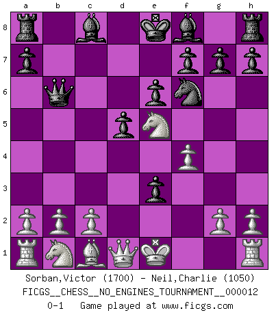 Last move : 0-1 2008 December 6 10:51:44 [Event "FICGS__CHESS__NO_ENGINES_TOURNAMENT__000012"] [Site "FICGS"] [Date "2008.10.10"] [Round "1"] [White "Sorban,Victor"] [Black "Neil,Charlie"] [Result "0-1"] [WhiteElo "1700"] [BlackElo "1050"] 1.f4 c5 2.Nf3 Nc6 3.e3 d5 4.Bb5 e6 5.Bxc6+ bxc6 6.d4 Nf6 7.Ne5 cxd4 8.Nxc6 Qb6 9.Ne5 dxe3 0-1 This chess game has been lost on time (started : 2008.10.10 12:4:51) Bird's Opening Player Black won this chess game. Follow this game move after move (download)Discovered check is the dive bomber of the Chessboard. (Reuben Fine) Man kann eine Schachpartie nur gewinnen, wenn das Gleichgewicht gestört ist. In einer Stellung mit ungestörtem Gleichgewicht ist auch das größte Genie hilflos - in der Stellung steckt dann eben kein genialer Einfall. (Wilhelm Steinitz) Yo siempre he tenido un ligero sentimiento de lástima por una persona que no tiene conocimiento del Ajedrez. (Siegbert Tarrasch) Même un GMI sait rarement calculer sur plus de cinq coups une attaque à sacrifices. (Rudolf Spielmann) Luck never made a man wise. (Seneca, Letters to Lucilius)