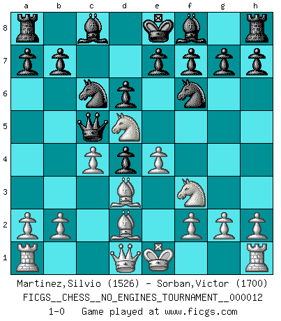 Last move : 1-0 2008 December 6 22:55:54 [Event "FICGS__CHESS__NO_ENGINES_TOURNAMENT__000012"] [Site "FICGS"] [Date "2008.10.10"] [Round "1"] [White "Martinez,Silvio"] [Black "Sorban,Victor"] [Result "1-0"] [WhiteElo "1526"] [BlackElo "1700"] 1.e4 c5 2.c4 d6 3.Nf3 Nc6 4.Nc3 Nf6 5.d4 Qa5 6.Bd2 cxd4 7.Nd5 Qc5 8.Bd3 1-0 This chess game has been lost on time (started : 2008.10.10 12:4:51) Sicilian defense Player White won this chess game. Follow this game move after move (download)If you aren't afraid of Spassky, then I have removed the element of money. (Jim Slater) Wenn sie aufgeben, dann danke ich Ihnen für das Spiel (Eventualzug beim Fernschach). (Anonymous) El Ajedrez es tan interesante por sí solo, que no es necesario un interés monetario para persuadir a una persona a que lo practique; por lo tanto, nunca se juega por dinero. (Benjamin Franklin) Les échecs sont plus proches de l'art de l'assassinat que de l'art de la guerre. (Arturo Perez-Reverte) Experiences are the keys to life. (Daniel Parmet)