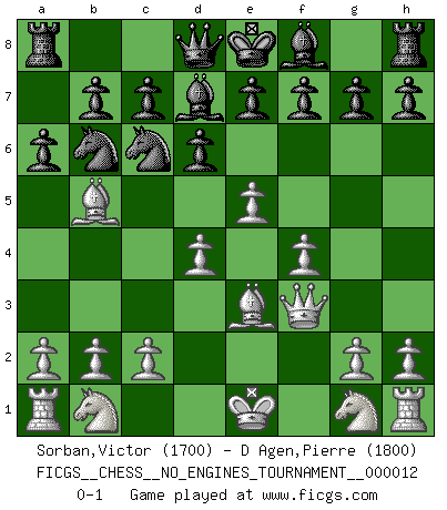 Last move : 0-1 2008 December 2 22:40:14 [Event "FICGS__CHESS__NO_ENGINES_TOURNAMENT__000012"] [Site "FICGS"] [Date "2008.10.10"] [Round "1"] [White "Sorban,Victor"] [Black "D Agen,Pierre"] [Result "0-1"] [WhiteElo "1700"] [BlackElo "1800"] 1.e4 Nf6 2.e5 Nd5 3.d4 d6 4.f4 Nc6 5.Bb5 Bd7 6.Qf3 Nb6 7.Be3 a6 0-1 This chess game has been lost on time (started : 2008.10.10 12:4:51) Alekhine's defense Player Black won this chess game. Follow this game move after move (download)A player surprised is half beaten. (Proverb) Kann Schach nicht schließlich das Nationalspiel der Deutschen werden? Und welche weiteren Ausblicke bieten sich dann dar! Welche Hebung des allgemeinen Kultur-Niveaus, ja der Moral, wenn das Schachbrett den Kartentisch verdrängen würde! Wahrlich, ein Ziel, des Schweißes der Edlen wert! (Siegbert Tarrasch) Yo nunca en mi vida he jugado la Defensa Francesa, que viene siendo la más aburrida de todas las Aperturas. (Wilhelm Steinitz) A chaque perte on perd un peu de soi. (Joël Lautier) Computers are like Old Testament gods; lots of rules and no mercy. (Joseph Campbell)