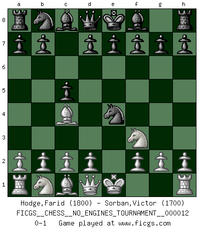 Last move : 0-1 2008 November 28 22:27:12 [Event "FICGS__CHESS__NO_ENGINES_TOURNAMENT__000012"] [Site "FICGS"] [Date "2008.10.10"] [Round "1"] [White "Hodge,Farid"] [Black "Sorban,Victor"] [Result "0-1"] [WhiteElo "1800"] [BlackElo "1700"] 1.e4 c5 2.Nf3 Nf6 3.Bc4 Nxe4 0-1 This chess game has been lost on time (started : 2008.10.10 12:4:51) Sicilian : Nimzovich-Rubinstein variation Player Black won this chess game. Follow this game move after move (download)I feel as if I were a piece in a game of Chess, when my opponent says of it: That piece cannot be moved. (Soren Kierkegaard) Wenn du auf das Glück wartest, wird das Leben ziemlich langweilig. (Mikhail Nekhemyevich Tal) Cuando tengas duda... ¡juega al Ajedrez!. (Tevis) Je crois qu'il existe des manières très spécifiques de jouer efficacement contre une machine. Evidemment, nous n'avons aucune chance en technique pure, parce que l'ordinateur calcule de manière parfaite. Mais lorsque nous faisons appel à notre cerveau, en utilisant l'intuition et la compréhension, alors nous restons beaucoup plus forts. (Anatoli Karpov) Pushing plastic is for the many, pushing virtual pieces is for the fewer, pushing wood is for the very few. (Normajean Yates)