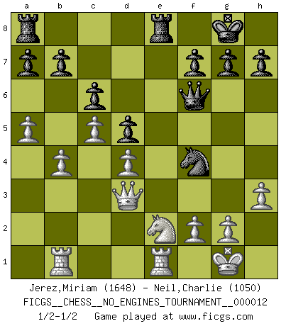 Last move : 1/2-1/2 2009 January 24 1:57:47 [Event "FICGS__CHESS__NO_ENGINES_TOURNAMENT__000012"] [Site "FICGS"] [Date "2008.10.10"] [Round "1"] [White "Jerez,Miriam"] [Black "Neil,Charlie"] [Result "1/2-1/2"] [WhiteElo "1648"] [BlackElo "1050"] 1.e4 c6 2.Nc3 d5 3.d4 dxe4 4.Nxe4 Bf5 5.Bd3 Bxe4 6.Bxe4 Nf6 7.Bf3 Qb6 8.Ne2 Nbd7 9.b3 e6 10.O-O Be7 11.c4 O-O 12.c5 Qc7 13.Bf4 Qd8 14.a4 Nd5 15.Bxd5 exd5 16.b4 Bf6 17.Rb1 Re8 18.a5 Nf8 19.Qd3 Ne6 20.Bd6 Be7 21.Bxe7 Qxe7 22.Rfe1 Qf6 23.h3 Nf4 1/2-1/2 Caro-Kann defense Kingside Castling by player White (move 10) Kingside Castling by player Black (move 11) This chess game ended in a draw. Follow this game move after move (download)A Chess game is a dialogue, a conversation between a player and his opponent. Each move by the opponent may contain threats or be a blunder, but a player cannot defend against threats or take advantage of blunders if he does not first ask himself: What is my opponent planning after each move ? (Bruce A. Moon) In Buenos Aires ist es nicht mein vorrangiges Ziel ein starkes Turnier zu organisieren, sondern ein Turnier für Gentlemen. Ich würde nie Kamsky einladen. Ich mag keine Probleme. (Miguel Najdorf) La maestría del Ajedrez consiste esencialmente en analizar posiciónes de Ajedrez con precisión. (Mikhail Botvinnik) Comme les marins qui ont mille raisons différentes d'aller en mer, les joueurs d'échecs en ont tout autant avant de s'installer devant une table et jouer... (Vincent Bertignac, philosophe) Difficult things take a long time, impossible things a little longer. (Author unknown)