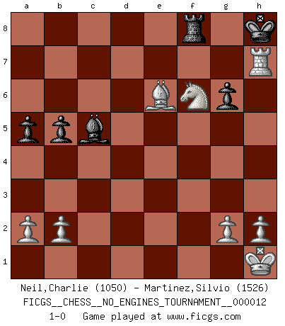 Last move : 1-0 2009 January 24 1:49:52 [Event "FICGS__CHESS__NO_ENGINES_TOURNAMENT__000012"] [Site "FICGS"] [Date "2008.10.10"] [Round "1"] [White "Neil,Charlie"] [Black "Martinez,Silvio"] [Result "1-0"] [WhiteElo "1050"] [BlackElo "1526"] 1.d4 d5 2.c4 Nf6 3.e3 c5 4.cxd5 cxd4 5.Qxd4 Qxd5 6.Qxd5 Nxd5 7.e4 Nb6 8.Nc3 e5 9.Nf3 Nc6 10.Bb5 Bd7 11.Be3 Bd6 12.O-O O-O 13.Nd5 Nxd5 14.Rad1 Nxe3 15.fxe3 Bc5 16.Rxd7 Bxe3+ 17.Kh1 a6 18.Bc4 Nd8 19.Nxe5 b5 20.Bb3 g6 21.Ng4 Bc5 22.e5 Kg7 23.e6 Nxe6 24.Bxe6 Kh8 25.R1xf7 Rxf7 26.Rxf7 a5 27.Nf6 Rf8 28.Rxh7+ 1-0 QGD : Marshall defense Kingside Castling by player White (move 12) Kingside Castling by player Black (move 12) Player White won this chess game. Follow this game move after move (download)Without error there can be no brilliancy. (Emanuel Lasker) Der Verteidiger gebe der Gewalt nach, aber nur der Gewalt. Er schaffe sich nicht freiwillig, etwa aus Blindheit oder aus Schrecken, irgendwelche Schwächen. Er lasse sich nicht bluffen. (Emanuel Lasker) El Ajedrez es realmente noventa y nueve por ciento calculación. (Soltis) C'est une question de caractère, Beaucoup de gens perdent leur motivation très vite. D'autres, ils sont rares, peuvent la conserver très longtemps. J'aime les échecs, encore aujourd'hui je suis heureux d'analyser des parties. J'aime toujours gagner, je déteste encore perdre. Bien jouer est important pour mon intégrité intellectuelle et morale. Et puis les échecs vivent en ce moment une période historique grâce à Internet. Ils se développent dans les systèmes éducatifs à travers le monde. Ils sortent de leur ghetto, et c'est mon rôle de mener à bien cette révolution. (Gary Kasparov) The large trees attract high winds. (Chinese proverb)