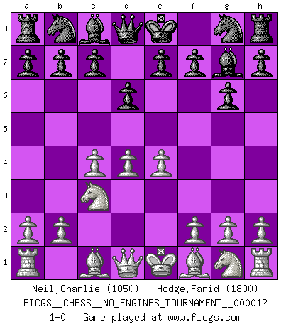 Last move : 1-0 2008 November 28 10:22:3 [Event "FICGS__CHESS__NO_ENGINES_TOURNAMENT__000012"] [Site "FICGS"] [Date "2008.10.10"] [Round "1"] [White "Neil,Charlie"] [Black "Hodge,Farid"] [Result "1-0"] [WhiteElo "1050"] [BlackElo "1800"] 1.c4 d6 2.Nc3 g6 3.e4 Bg7 4.d4 1-0 This chess game has been lost on time (started : 2008.10.10 12:4:51) English Opening Player White won this chess game. Follow this game move after move (download)The combination player thinks forward; he starts from the given position, and tries the forceful moves in his mind. (Emanuel Lasker) In der Schule lernt man nichts. Es ist nur Zeitverschwendung. (Robert James Fischer) Cuando le juegas a Fischer, no es una cuestion de si vas a ganar o perder. Es una cuestion de si vas a sobrevivir. (Boris Spassky) Tous ces prétendus hommes politiques sont les pions, les Cavaliers, les Tours ou les Fous d'une partie d'échecs qui se jouera tant qu'un hasard ne renversera pas l'échiquier. (Honoré de Balzac) If you don't practice you don't deserve to win. (Andre Agassi)