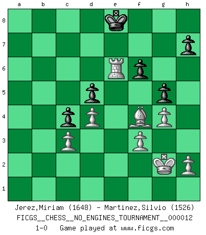 Last move : 1-0 2009 April 10 2:48:52 [Event "FICGS__CHESS__NO_ENGINES_TOURNAMENT__000012"] [Site "FICGS"] [Date "2008.10.10"] [Round "1"] [White "Jerez,Miriam"] [Black "Martinez,Silvio"] [Result "1-0"] [WhiteElo "1648"] [BlackElo "1526"] 1.e4 e5 2.Nf3 Nc6 3.Nc3 Nf6 4.Bc4 Bc5 5.O-O O-O 6.d3 Na5 7.Nxe5 Nxc4 8.Nxc4 d6 9.d4 Bb4 10.Bd2 Bxc3 11.Bxc3 Nxe4 12.Bb4 b5 13.Na5 c5 14.Be1 d5 15.Nc6 Qc7 16.Ne5 f6 17.Nf3 c4 18.b4 Bf5 19.Nh4 Qd7 20.f3 Ng5 21.g4 Be6 22.Bg3 a5 23.bxa5 Rxa5 24.c3 Qe7 25.a4 bxa4 26.Rxa4 Rxa4 27.Qxa4 Nh3+ 28.Kg2 g5 29.Nf5 Nf4+ 30.Bxf4 Qe8 31.Qxe8 Rxe8 32.Re1 Kf7 33.Nd6+ Kf8 34.Nxe8 Kxe8 35.Rxe6+ 1-0 Four knights : Italian variation Kingside Castling by player White (move 5) Kingside Castling by player Black (move 5) Player White won this chess game. Follow this game move after move (download)If a ruler does not understand Chess, how can he rule over a kingdom ? (King Khusros II) Ohne Leiden bildet sich kein Charakter. (Ernst Freiherr von Feuchtersleben) Nunca antes ha habido un jugador de Ajedrez con tal conocimiento a fondo de las complejidades del juego y una inmensa voluntad absolutamente indomable de ganar. Yo pienso que Fischer es el jugador mas grande que jamás haya existido. (Lisa Lane) Des points faibles ou des trous dans la position de l'adversaire doivent être occupés par des pièces et non pas par des pions. (Siegbert Tarrasch) All politicians must be presumed guilty until they are proven innocent. (Dinesh De Silva)