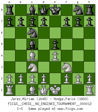 Last move : 1-0 2008 November 27 22:9:38 [Event "FICGS__CHESS__NO_ENGINES_TOURNAMENT__000012"] [Site "FICGS"] [Date "2008.10.10"] [Round "1"] [White "Jerez,Miriam"] [Black "Hodge,Farid"] [Result "1-0"] [WhiteElo "1648"] [BlackElo "1800"] 1.e4 e5 2.Nf3 Nc6 3.Nc3 Bc5 4.Bc4 1-0 This chess game has been lost on time (started : 2008.10.10 12:4:51) Three knights game Player White won this chess game. Follow this game move after move (download)With or without the title, Bobby Fischer was unquestionably the greatest player of his time. (Burt Hochberg) Offener Brief an US-Präsident Bush anlässlich der Verhaftung Bobby Fishers: Verhaften Sie mich. Stecken Sie mich in dieselbe Zelle wie Bobby Fisher und geben Sie uns ein Schachspiel mit. (Boris Vassilievich Spassky) Una partida de Ajedrez se divide en 3 etapas: la primera cuando piensas que tienes la ventaja, la segunda cuando crees que tienes la ventaja y la tercera... ¡cuando te das cuenta que vas a perder!. (Savielly Tartakower) Toutes les manuvres exécutées sur une colonne ouverte ont pour but ultime l'intrusion définitive sur la septième ou la huitième rangée, en plein cur de la position ennemie. (Aaron Nimzovitch) Life is like internet, nothing interesting, but noone want to leave it. (Ilmars Cirulis)
