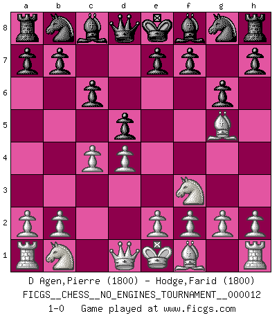 Last move : 1-0 2008 November 28 22:27:12 [Event "FICGS__CHESS__NO_ENGINES_TOURNAMENT__000012"] [Site "FICGS"] [Date "2008.10.10"] [Round "1"] [White "D Agen,Pierre"] [Black "Hodge,Farid"] [Result "1-0"] [WhiteElo "1800"] [BlackElo "1800"] 1.d4 d5 2.c4 c6 3.Nf3 g6 4.Bg5 1-0 This chess game has been lost on time (started : 2008.10.10 12:4:51) QGD Slav : 3.Nf3 Player White won this chess game. Follow this game move after move (download)Up to this point White has been following well-known analysis. But now he makes a fatal error: he begins to use his own head. (Siegbert Tarrasch) Jeder Fehler erscheint unglaublich dumm, wenn andre ihn begehen. (Georg Christoph Lichtenberg) El Ajedrez es una manera fabulosa para que los niños aprendan a autovalorarse y a autoestimarse. (Saudin Robovic) Même un GMI sait rarement calculer sur plus de cinq coups une attaque à sacrifices. (Rudolf Spielmann) I feel so... helpless. (C-3PO in Star Wars ep.3)