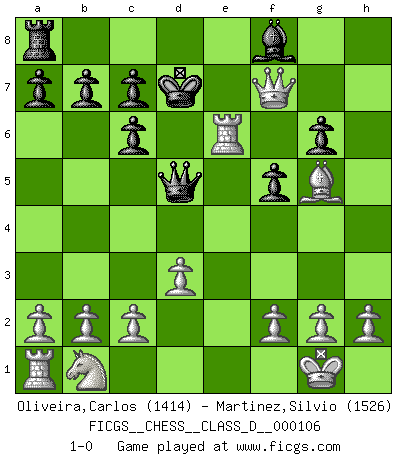 Last move : 1-0 2008 November 30 17:33:59 [Event "FICGS__CHESS__CLASS_D__000106"] [Site "FICGS"] [Date "2008.10.10"] [Round "1"] [White "Oliveira,Carlos"] [Black "Martinez,Silvio"] [Result "1-0"] [WhiteElo "1414"] [BlackElo "1526"] 1.e4 e5 2.Nf3 Nc6 3.Bb5 Nf6 4.Bxc6 dxc6 5.O-O Nxe4 6.Re1 f5 7.Nxe5 Qd5 8.Qh5+ g6 9.Nxg6 hxg6 10.Qxh8 Be6 11.d3 Ng5 12.Bxg5 Kf7 13.Qf6+ Ke8 14.Rxe6+ Kd7 15.Qf7+ 1-0 Ruy Lopez : Berlin defense Kingside Castling by player White (move 5) Player White won this chess game. Follow this game move after move (download)When you play Bobby, it is not a question if you win or lose. It is a question if you survive. (Boris Spassky) Der Freibauer hat für mich eine Seele, genau wie der Mensch, Wünsche, die unerkannt in ihm schlummern, und Befürchtungen, von deren Existenz er selbst kaum ahnt. (Aaron Nimzowitsch) En el Ajedrez, cuando menos, el valiente hereda la tierra. (Edmar Mednis) Il (Jacob Murray) ne joue pas pour le bon coup, mais pour le meilleur. (Eloi Relange) All battles are fought by scared men who'd rather be someplace else. (John Wayne in the movie In harm's way)