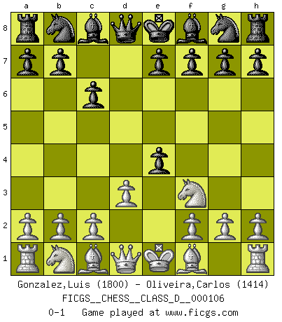 Last move : 0-1 2008 November 28 22:27:12 [Event "FICGS__CHESS__CLASS_D__000106"] [Site "FICGS"] [Date "2008.10.10"] [Round "1"] [White "Gonzalez,Luis"] [Black "Oliveira,Carlos"] [Result "0-1"] [WhiteElo "1800"] [BlackElo "1414"] 1.e4 c6 2.Nf3 d5 3.d3 dxe4 0-1 This chess game has been lost on time (started : 2008.10.10 12:16:44) Caro-Kann defense Player Black won this chess game. Follow this game move after move (download)Fischer, who may or may not be mad as a hatter, has every right to be horrified. (Jeremy Silman) Ich spiele ehrlich und spiele, um zu gewinnen. Wenn ich verliere nehme ich meine Medizin. (Robert James Fischer) El Ajedrez detiene a su maestro dentro de sus propios vínculos, encadenando la mente y el cerebro, por lo que la libertad interior del mas fuerte debe sufrir. (Albert Einstein) A chaque perte on perd un peu de soi. (Joël Lautier) Hello Thibault, if I have had a plan (and I had one, I hope), I have forgotten it during the last week... - Hello Heinz-Georg. What do you mean a plan ? (Anonymous players, during a Big Chess game)