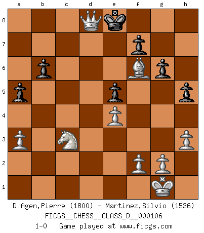 Last move : 1-0 2009 April 10 2:50:4 [Event "FICGS__CHESS__CLASS_D__000106"] [Site "FICGS"] [Date "2008.10.10"] [Round "1"] [White "D Agen,Pierre"] [Black "Martinez,Silvio"] [Result "1-0"] [WhiteElo "1800"] [BlackElo "1526"] 1.d4 d5 2.c4 c5 3.dxc5 Qc7 4.cxd5 Qxc5 5.Nc3 e5 6.e4 Nf6 7.Be3 Qa5 8.Bd3 Bd6 9.Nge2 Nbd7 10.O-O Ng4 11.Bd2 Bb4 12.a3 Bxc3 13.bxc3 O-O 14.Ng3 Ndf6 15.h3 Nh6 16.Bxh6 Qxc3 17.Be3 g6 18.Qc2 Qxc2 19.Bxc2 b6 20.Rfc1 Ba6 21.Rd1 Bc4 22.Bd3 Bxd3 23.Rxd3 Rfd8 24.d6 h5 25.Bg5 Kg7 26.Rc1 Rd7 27.Bxf6+ Kf8 28.Rc7 Ke8 29.Ne2 a5 30.Nc3 Rxc7 31.dxc7 Rc8 32.Rd8+ Rxd8 33.cxd8Q+ 1-0 QGD : Symmetrical (Austrian) defense Kingside Castling by player White (move 10) Kingside Castling by player Black (move 13) Promotion Queen by player White (move 33) Player White won this chess game. Follow this game move after move (download)To avoid losing a piece, many a person has lost the game. (Savielly Tartakover) Auf Remis zu spielen ist gewissermaßen ein Verbrechen gegen das Schachspiel. (Mikhail Nekhemyevich Tal) Un jugador que trata de regresar una movida en el Ajedrez es un futuro carterista. (Richard Fenton) Horreur, mais aussi harmonie suprême : qu'y avait-il en effet au monde en dehors des échecs ? Le brouillard, l'inconnu, le non-être... (Vladimir Nabokov) There's no money in correspondence chess. (John Knudsen)