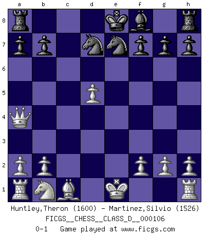 Last move : 0-1 2008 October 20 10:39:33 [Event "FICGS__CHESS__CLASS_D__000106"] [Site "FICGS"] [Date "2008.10.10"] [Round "1"] [White "Huntley,Theron"] [Black "Martinez,Silvio"] [Result "0-1"] [WhiteElo "1600"] [BlackElo "1526"] 1.c4 c5 2.Nf3 Nc6 3.d4 d5 4.dxc5 e5 5.cxd5 Nce7 6.e4 Nf6 7.Nxe5 Nxe4 8.Qa4+ Bd7 9.Nxd7 Qxd7 10.Bb5 Nxc5 11.Bxd7+ Nxd7 0-1 English : Symmetrical variation Player Black won this chess game. Follow this game move after move (download)I'd rather have a Pawn than a finger. (Reuben Fine) Wenn Spassky eine Figur opfert kannst du genauso gut aufgeben. Aber wenn Tal eine Figur opfert, spiel weiter. Er könnte noch eine weitere opfern, und dann ... wer weiß? (Miguel Najdorf) Todavía soy una víctima del Ajedrez. Tiene toda la belleza del arte y mucho mas. No puede ser comercializado. El Ajedrez es mas puro que el arte en su posición social. (Marcel Duchamp) Tous ces prétendus hommes politiques sont les pions, les Cavaliers, les Tours ou les Fous d'une partie d'échecs qui se jouera tant qu'un hasard ne renversera pas l'échiquier. (Honoré de Balzac) Fortune favours the audacious. (Desiderius Erasmus)