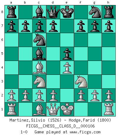 Last move : 1-0 2008 November 27 22:9:38 [Event "FICGS__CHESS__CLASS_D__000106"] [Site "FICGS"] [Date "2008.10.10"] [Round "1"] [White "Martinez,Silvio"] [Black "Hodge,Farid"] [Result "1-0"] [WhiteElo "1526"] [BlackElo "1800"] 1.e4 e5 2.Nf3 Nc6 3.Nc3 Bc5 4.Bc4 1-0 This chess game has been lost on time (started : 2008.10.10 12:16:44) Three knights game Player White won this chess game. Follow this game move after move (download)Fischer prefers to enter Chess history alone. (Miguel Najdorf) Über Frauen: Chess is better. (Robert James Fischer) Un entendimiento minucioso de las típicas continuaciones de mate hacen de las mas complicadas combinaciones de sacrificio que conducen hacia ellas no solo no dificiles, sino casi un asunto de rutina. (Siegbert Tarrasch) Roi des jeux et jeu des rois, les échecs portent en eux un sentiment d'infini. Ils donnent à celui qui s'est efforcé d'en approfondir les arcanes l'impression de n'être pas à la mesure de l'homme; en fait, ils constituent un résumé de l'univers, un microcosme, et figurent cette grande échelle qui, dans les plans de la lumière descend jusqu'à la matière, qui des abîmes insondables remonte jusqu'en l'infini de Dieu. (Pyrame) If you work for a living, why do you kill yourself working ? (Tuco to a chicken in The Good, The Bad and The Ugly)