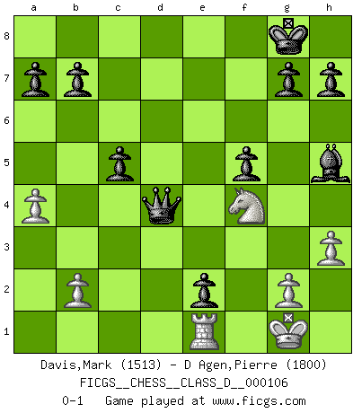 Last move : 0-1 2008 December 13 21:16:16 [Event "FICGS__CHESS__CLASS_D__000106"] [Site "FICGS"] [Date "2008.10.10"] [Round "1"] [White "Davis,Mark"] [Black "D Agen,Pierre"] [Result "0-1"] [WhiteElo "1513"] [BlackElo "1800"] 1.e4 Nf6 2.Nc3 e5 3.d4 Bb4 4.Bd2 exd4 5.Nb1 Bxd2+ 6.Nxd2 d6 7.Ngf3 Bg4 8.Be2 c5 9.O-O Nc6 10.Bb5 Qb6 11.a4 O-O 12.Nc4 Qc7 13.h3 Bh5 14.Qd3 Nb4 15.Qb3 Nxe4 16.Ncd2 Nxd2 17.Nxd2 Rad8 18.Ne4 Bg6 19.c3 dxc3 20.Bd3 Nxd3 21.Ng3 d5 22.Qxc3 Rfe8 23.Rad1 d4 24.Qa3 Nxf2 25.Kxf2 Re3 26.Qxe3 dxe3+ 27.Kg1 f5 28.Ne2 Bh5 29.Rxd8+ Qxd8 30.Nf4 e2 31.Re1 Qd4+ 0-1 Alekhine's defense Kingside Castling by player White (move 9) Kingside Castling by player Black (move 11) Player Black won this chess game. Follow this game move after move (download)Before the endgame, the Gods have placed the middle game. (Siegbert Tarrasch) Ich verstehe mehr vom Schach als irgendein anderer lebender Meister. (José Raúl Capablanca) Robert Fischer es la ley hacia si mismo. (Larry Evans) Les pièces de l'échiquier étaient impitoyables. Elles le retenaient, elles l'absorbaient. Il y avait de l'horreur en cela, mais aussi une harmonie unique. Car, qu'y a-t-il dans le monde, à part les échecs ? (V. Nabokov) The ultimate in disposing one's troops is to be without ascertainable shape. Then the most penetrating spies cannot pry in nor can the wise lay plans against you. (Sun Tzu)