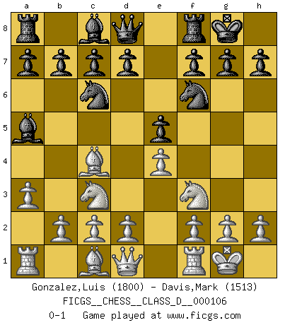 Last move : 0-1 2008 November 28 22:27:12 [Event "FICGS__CHESS__CLASS_D__000106"] [Site "FICGS"] [Date "2008.10.10"] [Round "1"] [White "Gonzalez,Luis"] [Black "Davis,Mark"] [Result "0-1"] [WhiteElo "1800"] [BlackElo "1513"] 1.e4 e5 2.Nf3 Nc6 3.Bc4 Nf6 4.Nc3 Bb4 5.a3 Ba5 6.O-O O-O 0-1 This chess game has been lost on time (started : 2008.10.10 12:16:44) Two knights defense Kingside Castling by player White (move 6) Kingside Castling by player Black (move 6) Player Black won this chess game. Follow this game move after move (download)Chess is no whit inferior to the violin, and we have a large number of professional violinists. (Mikhail Botvinnik) Im Reiche der Wirklichkeit ist man nie so glücklich wie im Reiche der Gedanken. (Arthur Schopenhauer) Siempre es mucho mejor sacrificar las piezas de tu oponente. (Savielly Tartakover) Le thème de l'attaque double intervient d'une manière ou d'une autre dans l'immense majorité des combinaisons. (Youri Averbakh) There are two major products that came out of Berkeley: LSD and UNIX. We do not believe this is to be a coincidence. (Jeremy S. Anderson)