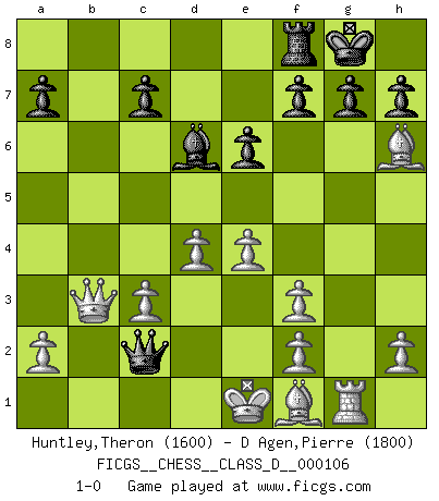 Last move : 1-0 2008 October 15 14:13:6 [Event "FICGS__CHESS__CLASS_D__000106"] [Site "FICGS"] [Date "2008.10.10"] [Round "1"] [White "Huntley,Theron"] [Black "D Agen,Pierre"] [Result "1-0"] [WhiteElo "1600"] [BlackElo "1800"] 1.d4 d5 2.c4 Nc6 3.Nc3 Nf6 4.Nf3 Bg4 5.cxd5 Nxd5 6.e4 Bxf3 7.gxf3 Nxc3 8.bxc3 e6 9.Rb1 Rb8 10.Qa4 Bd6 11.Rxb7 Rxb7 12.Qxc6+ Qd7 13.Qxb7 O-O 14.Rg1 Qa4 15.Bh6 Qc2 16.Qb3 1-0 QGD : Chigorin defense Kingside Castling by player Black (move 13) Player White won this chess game. Follow this game move after move (download)The Chess pieces are the block alphabet which shapes thoughts; and these thoughts, although making a visual design on the chessboard, express their beauty abstractly, like a poem. (Marcel Duchamp) Privat ist Kortschnoi kein schlechter Mensch, sehr sympathisch. Aber während des Spiels ist er grausam. Er will dich töten. (Miguel Najdorf) Las piezas de Ajedrez son los bloques del alfabeto que moldean los pensamientos; y esos pensamientos, aunque hagan un diseño visual en el tablero, expresan abstractamente su belleza como un poema. (Marcel Duchamp) La tactique, c'est ce que vous faites quand il y a quelque chose à faire; la stratégie, c'est ce que vous faites quand il n'y a rien à faire. (Savielli Tartacower) If you are good, you will be assigned all the work. If you are really good, you will get out of it. (Dan Rotaru)