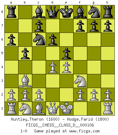 Last move : 1-0 2008 November 26 22:0:52 [Event "FICGS__CHESS__CLASS_D__000106"] [Site "FICGS"] [Date "2008.10.10"] [Round "1"] [White "Huntley,Theron"] [Black "Hodge,Farid"] [Result "1-0"] [WhiteElo "1600"] [BlackElo "1800"] 1.e4 e5 2.Nf3 Nc6 3.Bb5 d6 4.d4 a6 5.Ba4 b5 6.Bb3 1-0 This chess game has been lost on time (started : 2008.10.10 12:16:44) Ruy Lopez : Old Steinitz defense Player White won this chess game. Follow this game move after move (download)At this time Fischer is simply a level above all the best Chessplayers in the world. (John Jacobs) Herr Iljumschinow ist ein etwas merkwürdiger Geschäftsmann: Er arbeitet zusammen mit Leuten wie Muammar al-Gaddafi; früher ist das Saddam Hussein gewesen. (Joel Lautier) El Jaque al descubierto es el bombardero del tablero. (Reuben Fine) Je ne crois pas en la psychologie, je crois aux bons coups. (Robert Fischer) Control your own destiny or someone else will. (Jack Welch)