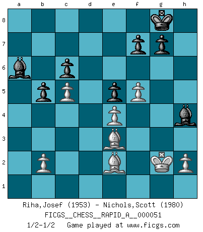 Last move : 1/2-1/2 2008 October 18 16:6:29 [Event "FICGS__CHESS__RAPID_A__000051"] [Site "FICGS"] [Date "2008.10.11"] [Round "1"] [White "Riha,Josef"] [Black "Nichols,Scott"] [Result "1/2-1/2"] [WhiteElo "1953"] [BlackElo "1980"] 1.e4 c5 2.Nf3 e6 3.d4 cxd4 4.Nxd4 a6 5.Nc3 Qc7 6.Bd3 Nf6 7.O-O Bd6 8.Kh1 Nc6 9.Be3 h5 10.Nxc6 dxc6 11.f4 Ng4 12.Qe2 e5 13.f5 b5 14.a4 Bb7 15.axb5 axb5 16.Rxa8+ Bxa8 17.Bd2 Be7 18.Nd1 Bb7 19.Nf2 Nxf2+ 20.Rxf2 Qd6 21.Be3 h4 22.Qg4 O-O 23.g3 Qf6 24.Rg2 Ra8 25.gxh4 Ra1+ 26.Rg1 Rxg1+ 27.Kxg1 Qxh4 28.Qxh4 Bxh4 29.Kg2 Be7 30.c4 Ba6 31.c5 Bh4 32.Be2 1/2-1/2 Sicilian : Kan, 5.Nc3 Kingside Castling by player White (move 7) Kingside Castling by player Black (move 22) This chess game ended in a draw. Follow this game move after move (download)Later, I began to succeed in decisive games. Perhaps because I realized a very simple truth: not only was I worried, but also my opponent. (Mikhail Tal) Über die Verhaftung Bobby Fischers: Warum es die Bush-Administration für nötig befindet einen 61 Jahre alten Mann zu hetzten, der für niemanden ausser sich selbste eine Gefahr darstellt ist ein Rätsel. (Nigel Short) El Ajedrez es en su esencia, un juego. En su forma, un arte. Y en su ejecución, una ciencia. (Baron Tassilo) Même si l'adversaire joue le coup analysé précédemment, recommencez l'analyse en voyant la nouvelle position. Première règle de Blumenfeld However beautiful the strategy, you should occasionally look at the results. (Winston Churchill)