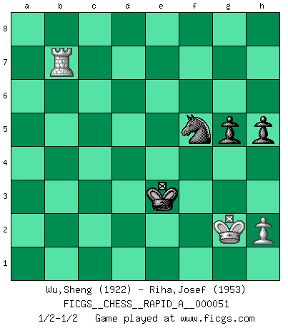 Last move : 1/2-1/2 2009 January 11 15:20:7 [Event "FICGS__CHESS__RAPID_A__000051"] [Site "FICGS"] [Date "2008.10.11"] [Round "1"] [White "Wu,Sheng"] [Black "Riha,Josef"] [Result "1/2-1/2"] [WhiteElo "1922"] [BlackElo "1953"] 1.d4 Nf6 2.c4 e6 3.Nf3 Bb4+ 4.Bd2 Qe7 5.g3 Nc6 6.Nc3 Bxc3 7.Bxc3 Ne4 8.Rc1 O-O 9.Bg2 d6 10.d5 Nd8 11.O-O e5 12.c5 Nxc5 13.Nxe5 dxe5 14.Bb4 b6 15.d6 cxd6 16.Bxa8 Bh3 17.Bg2 Bxg2 18.Kxg2 Nc6 19.Bxc5 dxc5 20.Qd5 Nb4 21.Qc4 Nc6 22.Qe4 Qe6 23.Rcd1 Re8 24.Rd2 f5 25.Qd5 Qxd5+ 26.Rxd5 Kf7 27.Rfd1 g6 28.Rd7+ Re7 29.f3 Ke8 30.R7d6 Rc7 31.Re6+ Kf7 32.R1d6 Na5 33.b3 c4 34.Rf6+ Kg7 35.bxc4 Nxc4 36.Rc6 Rd7 37.g4 e4 38.gxf5 exf3+ 39.exf3 Ne3+ 40.Kh3 Nxf5 41.Rfe6 Kh6 42.Rc3 Kg5 43.a4 Rd2 44.a5 bxa5 45.Ra3 Rd5 46.Ra6 Kf4 47.Rxa7 h5 48.R7xa5 Rxa5 49.Rxa5 Kxf3 50.Rb5 Ke4 51.Kg2 g5 52.Rb4+ Ke3 53.Rb7 1/2-1/2 Bogo-Indian defense, Nimzovich variation Kingside Castling by player Black (move 8) Kingside Castling by player White (move 11) 10 pieces endgame at move 48 : White KRRPP , Black KRNPP WHITE : King + 2 Rooks 2 Pawns BLACK : King + 1 Rook 1 Knight 2 Pawns 9 pieces endgame at move 48 : White KRPP , Black KRNPP WHITE : King + 1 Rook 2 Pawns BLACK : King + 1 Rook 1 Knight 2 Pawns 8 pieces endgame at move 49 : White KRPP , Black KNPP WHITE : King + 1 Rook 2 Pawns BLACK : King + 1 Knight 2 Pawns 7 pieces endgame at move 49 : White KRP , Black KNPP WHITE : King + 1 Rook 1 Pawn BLACK : King + 1 Knight 2 Pawns This chess game ended in a draw. Follow this game move after move (download)The passed Pawn is a criminal, who should be kept under lock and key. Mild measures, such as police surveillance, are not sufficient. (Aaron Nimzovich) Ein Remis kann durch Wiederholung von drei Zügen oder durch einen schlechte Zug erreicht werden. (Savielly Grigorievitsch Tartakower) El Ajedrez hace al hombre ser mas sabio y ver mas claro. (Vladimir Putin) On a dit que l'homme se distingue de l'animal par le fait qu'il achète plus de livres qu'il ne peut en lire. Je voudrais suggérer qu'inclure à la liste des livres quelques livres d'échecs rendrait la distinction manifeste. (Edward Lasker) If passion drives you, let reason holds the reins. (Benjamin Franklin)