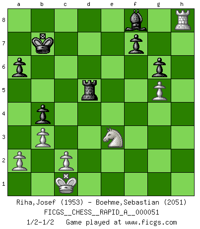 Last move : 1/2-1/2 2008 October 21 16:46:35 [Event "FICGS__CHESS__RAPID_A__000051"] [Site "FICGS"] [Date "2008.10.11"] [Round "1"] [White "Riha,Josef"] [Black "Boehme,Sebastian"] [Result "1/2-1/2"] [WhiteElo "1953"] [BlackElo "2051"] 1.e4 c5 2.Nf3 d6 3.d4 cxd4 4.Nxd4 Nf6 5.Nc3 a6 6.Be3 e6 7.f3 b5 8.Qd2 Nbd7 9.g4 b4 10.Nce2 h6 11.O-O-O Qc7 12.h4 d5 13.Bg2 dxe4 14.g5 hxg5 15.hxg5 Rxh1 16.Rxh1 Nd5 17.fxe4 Nxe3 18.Qxe3 Ne5 19.Nf4 g6 20.Nd5 exd5 21.exd5 Bb7 22.Nf3 O-O-O 23.Nxe5 Bxd5 24.Bxd5 Rxd5 25.Rh8 Qe7 26.b3 Kb7 27.Nc4 Qxe3+ 28.Nxe3 1/2-1/2 Sicilian : Najdorf, Byrne (English) attack Queenside Castling by player White (move 11) Queenside Castling by player Black (move 22) This chess game ended in a draw. Follow this game move after move (download)A strong memory, concentration, imagination, and a strong will is required to become a great Chess player. (Bobby Fischer) Früher wurde jeder komplizierte Zug, jedes interessante Opfer mit großem Beifall und Enthusiasmus aufgenommen. Heute schaltet man einfach seinen Fritz an, und man kann sehen, was los ist, ob der Zug geht oder nicht. (Vladimir Kramnik) Los problemas de Ajedrez exigen del compositor las mismas virtudes que caracterizan todo el arte de valor: originalidad, invención, concisión, armonía, complejidad e insinceridad explendida. (Vladimir Nabokov) Soyez une menace à chaque fois que vous vous asseyez pour jouer. (Ken Smith) Memory is a crazy woman that hoards colored rags and throws away food. (Austin O'Malley)