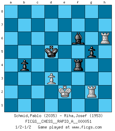 Last move : 1/2-1/2 2009 January 19 0:1:48 [Event "FICGS__CHESS__RAPID_A__000051"] [Site "FICGS"] [Date "2008.10.11"] [Round "1"] [White "Schmid,Pablo"] [Black "Riha,Josef"] [Result "1/2-1/2"] [WhiteElo "2035"] [BlackElo "1953"] 1.d4 Nf6 2.f3 d5 3.e4 dxe4 4.Nc3 exf3 5.Nxf3 Bg4 6.h3 Bh5 7.g4 Bg6 8.Ne5 e6 9.Qf3 c6 10.g5 Nh5 11.Bd3 Qxd4 12.Nxg6 hxg6 13.Rf1 Nd7 14.Qxf7+ Kd8 15.Qxe6 Ng3 16.Rf3 Qh4 17.Be3 Nf5 18.Bf2 Nd4 19.Bxh4 Nxe6 20.Bg3 Nxg5 21.Rf1 Rxh3 22.Kf2 Bb4 23.Rfe1 Bc5+ 24.Kg2 Rxg3+ 25.Kxg3 Bd6+ 26.Kg2 Ne5 27.Ne4 Nxe4 28.Rxe4 Kc7 29.Rae1 Nxd3 30.cxd3 Rh8 31.Rg4 Rh2+ 32.Kf3 Rh3+ 33.Ke4 Rh5 34.Reg1 Re5+ 35.Kf3 Rf5+ 36.Ke2 Ra5 37.a3 Be7 38.Rxg6 Bf6 39.Rb1 Rh5 40.Kf3 a5 41.b3 Kd6 42.Rg2 b5 43.Ke3 Rh4 44.Kd2 c5 45.Kc2 Rf4 46.Re2 Kd5 47.Rh2 g5 48.Rg1 a4 49.bxa4 Rxa4 50.Rh6 Rf4 51.Rg2 Rf1 52.Kd2 b4 53.axb4 cxb4 54.Ke2 Rf4 1/2-1/2 Blackmar-Diemer gambit 10 pieces endgame at move 53 : White KRRPP , Black KRBPP WHITE : King + 2 Rooks 2 Pawns BLACK : King + 1 Rook 1 Bishop 2 Pawns 9 pieces endgame at move 53 : White KRRP , Black KRBPP WHITE : King + 2 Rooks 1 Pawn BLACK : King + 1 Rook 1 Bishop 2 Pawns This chess game ended in a draw. Follow this game move after move (download)I have added these principles to the law: get the Knights into action before both Bishops are developed. (Emanuel Lasker) Man braucht nicht immer den besten Zug zu spielen: Ein Zug muß aktiv, unternehmungslustig, korrekt und schön sein. (David Bronstein) El Ajedrez demanda una total concentración. (Bobby Fischer) Aux échecs, l'amour-propre est satisfait quand on remporte la victoire, mais il n'y a pas de honte à être battu. (Benjamin Franklin) If we don't succeed, we run the risk of failure. (George W. Bush)