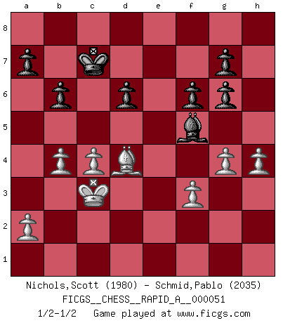 Last move : 1/2-1/2 2008 November 1 18:47:14 [Event "FICGS__CHESS__RAPID_A__000051"] [Site "FICGS"] [Date "2008.10.11"] [Round "1"] [White "Nichols,Scott"] [Black "Schmid,Pablo"] [Result "1/2-1/2"] [WhiteElo "1980"] [BlackElo "2035"] 1.e4 e5 2.Nf3 Nc6 3.c3 Nf6 4.d4 Nxe4 5.d5 Ne7 6.Nxe5 Ng6 7.Nxg6 hxg6 8.Bd3 Nc5 9.O-O Nxd3 10.Qxd3 Be7 11.Re1 O-O 12.Qe2 Bf6 13.Nd2 d6 14.Ne4 Bd7 15.Be3 Re8 16.Nxf6+ Qxf6 17.Qc4 c5 18.dxc6 Bxc6 19.f3 Qf5 20.Rad1 Re6 21.Bf2 Rxe1+ 22.Rxe1 Re8 23.Rxe8+ Bxe8 24.Qe2 Qb1+ 25.Qe1 Qxe1+ 26.Bxe1 Kf8 27.h4 Ke7 28.c4 Bd7 29.Kf2 Be6 30.b3 Bf5 31.Ke3 Bb1 32.Kd2 Bf5 33.Kc3 Kd7 34.Bf2 b6 35.Bd4 f6 36.b4 Kc7 37.g4 1/2-1/2 Ponziani : Jaenisch counter-attack Kingside Castling by player White (move 9) Kingside Castling by player Black (move 11) This chess game ended in a draw. Follow this game move after move (download)The King is a fighting piece. Use it ! (Wilhelm Steinitz) Kombinieren und Schwarzhandel gehören verboten. (Savielly Grigorievitsch Tartakower) ¡Examina movidas que hagan daño! Un buen ojo for movidas desvastantes es mucho mas importante que el conocimiento de principios estratégicos. (Purdy) Dieu déplace le joueur, et celui-ci la pièce. Quel Dieu derrière Dieu commence donc la trame ? Arturo Perez-Reverte (prix de littérature policière 1993). Faith : not wanting to know what is true. (Friedrich Nietzsche)