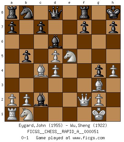 Last move : 0-1 2008 December 18 14:55:20 [Event "FICGS__CHESS__RAPID_A__000051"] [Site "FICGS"] [Date "2008.10.11"] [Round "1"] [White "Eygard,John"] [Black "Wu,Sheng"] [Result "0-1"] [WhiteElo "1955"] [BlackElo "1922"] 1.e4 e5 2.f4 exf4 3.Nf3 g5 4.h4 g4 5.Ne5 Nf6 6.Bc4 d5 7.exd5 Bd6 8.d4 Nh5 9.O-O O-O 10.Rxf4 Nxf4 11.Bxf4 Bf5 12.Bg3 Kh8 13.Qf1 Bxc2 14.Qf2 b5 0-1 This chess game has been lost on time (started : 2008.10.11 1:58:27) KGA : Kieseritsky, Berlin defense, 6.Bc4 Kingside Castling by player White (move 9) Kingside Castling by player Black (move 9) Player Black won this chess game. Follow this game move after move (download)There are tough players and nice guys, and I'm a tough player. (Bobby Fischer) Wenn du nicht weißt was du tun sollst, warte bis dein Gegner eine Idee hat. Sie wird sicher schlecht sein. (Siegbert Tarrasch) En la vida, como en el Ajedrez, los Peones propios obstruyen nuestro camino. La gran fortuna de un hombre, su comodidad, placer, hijos, libros, que deberían ayudarle a ganar, con mucha frecuencia lo ponen en Jaque Mate. (Charles Buxton) La tactique, c'est ce que vous faites quand il y a quelque chose à faire; la stratégie, c'est ce que vous faites quand il n'y a rien à faire. (Savielli Tartacower) A shortcut is the longest distance between two points. (Don Groves)