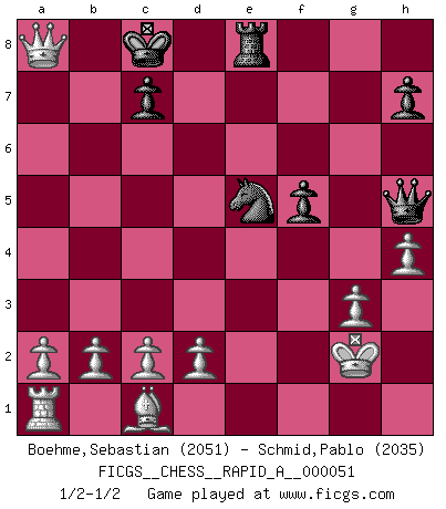 Last move : 1/2-1/2 2008 November 1 18:46:50 [Event "FICGS__CHESS__RAPID_A__000051"] [Site "FICGS"] [Date "2008.10.11"] [Round "1"] [White "Boehme,Sebastian"] [Black "Schmid,Pablo"] [Result "1/2-1/2"] [WhiteElo "2051"] [BlackElo "2035"] 1.e4 e5 2.Nf3 Nc6 3.Bb5 f5 4.Nc3 fxe4 5.Nxe4 d5 6.Nxe5 dxe4 7.Nxc6 Qg5 8.Qe2 Nf6 9.f4 Qxf4 10.Nxa7 Bd7 11.Bxd7+ Kxd7 12.Qb5+ Ke6 13.Qxb7 Bd6 14.Qb3+ Kd7 15.Qf7+ Kd8 16.Nc6+ Kc8 17.Ne7+ Bxe7 18.Qxe7 Re8 19.Qc5 Ra6 20.g3 Qh6 21.O-O Nd7 22.Qe3 Qh5 23.h4 Ne5 24.Qxe4 Rf6 25.Rxf6 gxf6 26.Kg2 f5 27.Qa8+ 1/2-1/2 Ruy Lopez : Schliemann defense, Berger variation Kingside Castling by player White (move 21) This chess game ended in a draw. Follow this game move after move (download)When you don't know what to do, wait for your opponent to get an idea - it's sure to be wrong. (Tarrasch) Bobby Fischer ist kein Vorbild für die heutige Jugend. (Viktor Kortschnoi) Ciertamente el estado mental actual de Bobby Fischer es una tragedia. Uno de los mas grandes jugadores de Ajedrez del mundo -el orgullo y pena del Ajedrez Americano. (Frank Brady) Même si l'adversaire joue le coup analysé précédemment, recommencez l'analyse en voyant la nouvelle position. Première règle de Blumenfeld It is a good thing for an uneducated man to read books of quotations. (Winston Churchill)