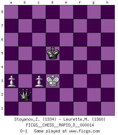 Last move : 0-1 2008 November 3 17:10:50 [Event "FICGS__CHESS__RAPID_D__000014"] [Site "FICGS"] [Date "2008.10.11"] [Round "1"] [White "Stoyanov,Zdravko"] [Black "Leurette,Marc-Antoine"] [Result "0-1"] [WhiteElo "1334"] [BlackElo "1360"] 1.e4 e5 2.Nf3 Nc6 3.Bb5 Nf6 4.Bxc6 dxc6 5.d3 Bg4 6.h3 Bxf3 7.Qxf3 Be7 8.Nd2 c5 9.Nc4 Bd6 10.Nxd6+ cxd6 11.Bg5 Qa5+ 12.c3 b5 13.Bxf6 gxf6 14.Qxf6 Rg8 15.O-O Qd8 16.Qh6 Qg5 17.Qxg5 Rxg5 18.Rfe1 a5 19.a3 a4 20.Re3 Ke7 21.Rf3 Rag8 22.g4 h5 23.Rg3 hxg4 24.h4 R5g6 25.Re1 Rh8 26.R1e3 Rxh4 27.f3 c4 28.Kg2 Ke6 29.Kg1 f5 30.exf5+ Kxf5 31.Kg2 d5 32.dxc4 bxc4 33.fxg4+ Rhxg4 34.Ref3+ Rf4 35.Rxg6 Kxg6 36.Kf2 Kg5 37.Ke2 Rxf3 38.Kxf3 e4+ 39.Ke3 Kf5 40.Kd4 Kf4 41.Kxd5 e3 42.Kxc4 e2 43.Kb4 e1Q 44.Kxa4 Qd1+ 45.Kb4 Qd6+ 46.Kb3 Ke4 47.Kc4 Qc6+ 48.Kb3 Kd5 49.Kc2 Qa4+ 50.Kd2 Qb3 51.Kd3 Qxb2 0-1 Ruy Lopez : Berlin defense Kingside Castling by player White (move 15) 10 pieces endgame at move 37 : White KPPP , Black KRPPPP WHITE : King + 3 Pawns BLACK : King + 1 Rook 4 Pawns 9 pieces endgame at move 38 : White KPPP , Black KPPPP WHITE : King + 3 Pawns BLACK : King + 4 Pawns 8 pieces endgame at move 41 : White KPPP , Black KPPP WHITE : King + 3 Pawns BLACK : King + 3 Pawns 7 pieces endgame at move 42 : White KPPP , Black KPP WHITE : King + 3 Pawns BLACK : King + 2 Pawns Promotion Queen by player Black (move 43) 6 pieces endgame at move 44 : White KPPP , Black KQ WHITE : King + 3 Pawns BLACK : King + 1 Queen 5 pieces endgame at move 51 : White KPP , Black KQ WHITE : King + 2 Pawns BLACK : King + 1 Queen Player Black won this chess game. Follow this game move after move (download)After black's reply to 1.e4 with 1..e5, leaves him always trying to get into the game. (Howard Staunton) Das typische an einem Großmeister ist, daß er eine gewonnene Position schnell und schmerzlos gewinnt. (Irving Chernev) Durante una competencia de Ajedrez, un Maestro de Ajedrez deberá ser una combinación de presa de caza y un Monge. (Alexander Alekhine) J'ai vu le vaincu d'Echecs jouer des années durant dans l'espoir de la fête de la victoire. Car tu es plus riche de ce qu'elle existe si même elle n'est point pour toi. Ainsi de la perle du fond des mers. (Antoine de Saint-Exupéry) Creativity involves breaking out of established patterns in order to look at things in a different way. (Edward De Bono)