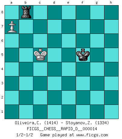 Last move : 1/2-1/2 2008 December 13 7:1:41 [Event "FICGS__CHESS__RAPID_D__000014"] [Site "FICGS"] [Date "2008.10.11"] [Round "1"] [White "Oliveira,Carlos"] [Black "Stoyanov,Zdravko"] [Result "1/2-1/2"] [WhiteElo "1414"] [BlackElo "1334"] 1.e4 c6 2.d4 e6 3.c4 d5 4.cxd5 cxd5 5.e5 Bb4+ 6.Bd2 Bxd2+ 7.Nxd2 Nc6 8.Ngf3 a6 9.a3 Nge7 10.Bd3 Qb6 11.Nb3 Na5 12.Nxa5 Qxa5+ 13.Qd2 Nc6 14.Qxa5 Nxa5 15.O-O O-O 16.b4 Nc6 17.Rac1 Bd7 18.Rc5 b6 19.Rc3 h6 20.Rfc1 Rfc8 21.Bxa6 Rxa6 22.b5 R6a8 23.bxc6 Be8 24.c7 b5 25.Ne1 Ra4 26.Nc2 Kh7 27.f4 Rc4 28.Rxc4 bxc4 29.Kf2 Rxc7 30.Rb1 Kg6 31.g4 h5 32.h3 h4 33.Ke2 Kh6 34.Kd2 f6 35.exf6 gxf6 36.Kc3 Kg6 37.Rb6 Bd7 38.Nb4 Ra7 39.Kb2 c3+ 40.Kb3 Kh6 41.f5 exf5 42.Nxd5 fxg4 43.Nxf6 Kg5 44.Nxg4 Bxg4 45.hxg4 Kxg4 46.Rg6+ Kf5 47.Rh6 Kg5 48.Rh8 Rc7 49.Kc2 Kg4 50.d5 Rd7 51.Kxc3 Rxd5 52.a4 h3 53.Rxh3 Kxh3 54.Kb4 Rd8 55.a5 Rb8+ 56.Kc5 Kg4 57.a6 Kf5 58.a7 1/2-1/2 Caro-Kann defense Kingside Castling by player White (move 15) Kingside Castling by player Black (move 15) 10 pieces endgame at move 44 : White KRPPP , Black KRBPP WHITE : King + 1 Rook 3 Pawns BLACK : King + 1 Rook 1 Bishop 2 Pawns 9 pieces endgame at move 45 : White KRPPP , Black KRPP WHITE : King + 1 Rook 3 Pawns BLACK : King + 1 Rook 2 Pawns 8 pieces endgame at move 45 : White KRPP , Black KRPP WHITE : King + 1 Rook 2 Pawns BLACK : King + 1 Rook 2 Pawns 7 pieces endgame at move 51 : White KRPP , Black KRP WHITE : King + 1 Rook 2 Pawns BLACK : King + 1 Rook 1 Pawn 6 pieces endgame at move 51 : White KRP , Black KRP WHITE : King + 1 Rook 1 Pawn BLACK : King + 1 Rook 1 Pawn 5 pieces endgame at move 53 : White KRP , Black KR WHITE : King + 1 Rook 1 Pawn BLACK : King + 1 Rook 4 pieces endgame at move 53 : White KP , Black KR WHITE : King + 1 Pawn BLACK : King + 1 Rook This chess game ended in a draw. Follow this game move after move (download)In the perfect Chess combination as in a first-rate short story, the whole plot and counter-plot should lead up to a striking finale, the interest not being allayed until the very last moment. (Yates and Winter) Wenn man heute mit 14 Jahren noch kein GM ist, kann man es vergessen. (Viswanathan Anand) Bobby es la celebridad menos entendida y malinterpretada que camina el la faz de esta tierra. (Yasser Seirawan) Mon pion favori sur ma case favorite ! Bronstein en parlant d'un coup de pion en h5 quand il avait les Noirs. I find your interest interesting. (Gregory House, House M.D.)