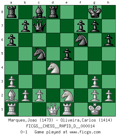 Last move : 0-1 2008 November 27 11:5:40 [Event "FICGS__CHESS__RAPID_D__000014"] [Site "FICGS"] [Date "2008.10.11"] [Round "1"] [White "Marques,Joao"] [Black "Oliveira,Carlos"] [Result "0-1"] [WhiteElo "1473"] [BlackElo "1414"] 1.e4 c6 2.d4 d5 3.Nc3 dxe4 4.Nxe4 Nd7 5.Nf3 Ngf6 6.Nc3 e6 7.Bc4 Be7 8.O-O O-O 9.Bg5 c5 10.Re1 cxd4 11.Nxd4 h6 12.Bh4 a6 13.a3 Qc7 14.Bb3 Nc5 15.Ba2 Rd8 16.Bg3 Bd6 17.Nce2 Bxg3 18.fxg3 e5 0-1 Caro-Kann : Steinitz variation Kingside Castling by player White (move 8) Kingside Castling by player Black (move 8) Player Black won this chess game. Follow this game move after move (download)Strategy requires thought, tactics require observation. (Max Euwe) Immer nach dem besten Zug zu suchen ist ziemlich unpraktisch. (Nigel Short) El Ajedrez es un invernadero donde los frutos del carácter pueden madurar mas completamente que en la vida. (Edward Morgan Foster) Dieu déplace le joueur, et celui-ci la pièce. Quel Dieu derrière Dieu commence donc la trame ? Arturo Perez-Reverte (prix de littérature policière 1993). The best weapon against an enemy is another enemy. (Friedrich Nietzsche)