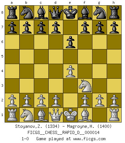 Last move : 1-0 2008 November 18 21:25:30 [Event "FICGS__CHESS__RAPID_D__000014"] [Site "FICGS"] [Date "2008.10.11"] [Round "1"] [White "Stoyanov,Zdravko"] [Black "Magroyne,Holden"] [Result "1-0"] [WhiteElo "1334"] [BlackElo "1400"] 1.e4 e6 2.Nf3 1-0 This chess game has been lost on time (started : 2008.10.11 7:15:23) French defense Player White won this chess game. Follow this game move after move (download)It began to feel as though you were playing against Chess itself. - On playing against Robert Fischer. (Walter Shipman) Ein typischer, sehr verbreiteter Gedankenschädling ist der, daß der betreffende Amateur von der Annanhme ausgeht, daß jeder einzelne Zug etwas zu leisten habe. (Aaron Nimzowitsch) El hombre es un frívolo, una creatura engañosa y como un jugador de Ajedrez, se preocupa mas por el proceso de obtener su meta que de la meta por sí misma. (Dostoyevsky) Des idées, des idées, j'en ai cent, j'en ai mille. Des bonnes, des mauvaises, applicables, irréalisables... Il suffit de faire le tri ! (Roos) Plans are ideas that never come to fruition. (Daniel Parmet)