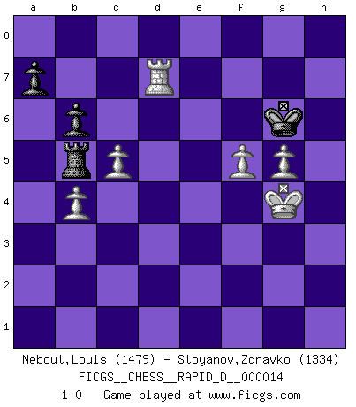 Last move : 1-0 2008 December 9 18:46:29 [Event "FICGS__CHESS__RAPID_D__000014"] [Site "FICGS"] [Date "2008.10.11"] [Round "1"] [White "Nebout,Louis"] [Black "Stoyanov,Zdravko"] [Result "1-0"] [WhiteElo "1479"] [BlackElo "1334"] 1.e4 c6 2.d4 e6 3.Nf3 d5 4.Nbd2 c5 5.c3 c4 6.Be2 Be7 7.O-O dxe4 8.Nxe4 Nf6 9.Nxf6+ Bxf6 10.Bxc4 O-O 11.Bf4 h6 12.Qd2 Nd7 13.Bd3 Nb6 14.Bxh6 Re8 15.Bg5 Nd5 16.h4 Bxg5 17.Nxg5 f6 18.Nf3 e5 19.dxe5 fxe5 20.Bc4 Be6 21.Ng5 Nf4 22.Qxd8 Raxd8 23.Bxe6+ Nxe6 24.Nxe6 Rxe6 25.Rad1 Red6 26.Rxd6 Rxd6 27.Re1 Rd2 28.b3 Rxa2 29.Rxe5 Ra3 30.Rb5 b6 31.g4 Ra1+ 32.Kg2 Rc1 33.c4 Rc3 34.f3 Kf7 35.Kg3 g6 36.g5 Kg7 37.Kg4 Kf7 38.f4 Kg7 39.h5 gxh5+ 40.Kxh5 Rc2 41.Rd5 Rh2+ 42.Kg4 Ra2 43.c5 Ra5 44.b4 Rb5 45.Rd7+ Kg6 46.f5+ 1-0 Caro-Kann defense Kingside Castling by player White (move 7) Kingside Castling by player Black (move 10) 10 pieces endgame at move 40 : White KRPPPP , Black KRPP WHITE : King + 1 Rook 4 Pawns BLACK : King + 1 Rook 2 Pawns Player White won this chess game. Follow this game move after move (download)Becoming successful at Chess allows you to discover your own personality. That's what I want for the kids I teach. (Saudin Robovic) Wie kann ich Remis annehmen? Ich weiß ja gar nicht, wie ich stehe! (Fritz Sämisch) El estómago es una parte esencial del maestro de Ajedrez. (Bent Larsen) Ce qui est bien, c'est d'avoir tout un tas de pièces en prise : l'adversaire ne peut en prendre qu'une à la fois. Cité par Thierry Audin. Computers have lots of memory but no imagination. (Anonymous)