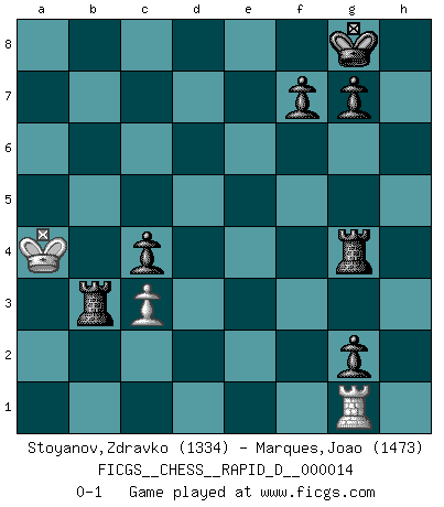 Last move : 0-1 2008 November 7 19:34:58 [Event "FICGS__CHESS__RAPID_D__000014"] [Site "FICGS"] [Date "2008.10.11"] [Round "1"] [White "Stoyanov,Zdravko"] [Black "Marques,Joao"] [Result "0-1"] [WhiteElo "1334"] [BlackElo "1473"] 1.e4 e5 2.Nf3 Nc6 3.a3 Nf6 4.d3 Be7 5.Be2 O-O 6.Be3 d5 7.Nbd2 dxe4 8.dxe4 Bg4 9.h3 Bh5 10.Nh4 Bxe2 11.Qxe2 Nxe4 12.Nf5 Nxd2 13.Bxd2 Bg5 14.O-O-O Qf6 15.Ng3 Nd4 16.Qe1 Qc6 17.Qe4 Nb3+ 18.Kb1 Nxd2+ 19.Rxd2 Bxd2 20.f3 Qxe4 21.Nxe4 Ba5 22.Nc5 b5 23.Nd7 Rfe8 24.b4 Bb6 25.Nxb6 axb6 26.Kb2 c5 27.Kb3 e4 28.fxe4 Rxe4 29.Rd1 Re3+ 30.c3 Re2 31.g4 Re3 32.h4 Rg3 33.g5 Rh3 34.Rd7 Rb8 35.bxc5 bxc5 36.Ra7 Rxh4 37.g6 hxg6 38.Rc7 c4+ 39.Kb4 g5 40.Rc5 g4 41.Rd5 g3 42.Rd1 g2 43.Rg1 Rg4 44.a4 bxa4 45.Kxa4 Rb3 0-1 King's pawn game Kingside Castling by player Black (move 5) Queenside Castling by player White (move 14) 10 pieces endgame at move 45 : White KRP , Black KRRPPPP WHITE : King + 1 Rook 1 Pawn BLACK : King + 2 Rooks 4 Pawns Player Black won this chess game. Follow this game move after move (download)Castle early and often. (Rob Sillars) Je mehr wir mit Computern analysieren, desto mehr glauben wir an Verteidigung. (Vladimir Kramnik) Bobby Fischer es el mas grande genio de Ajedrez de todos los tiempos. (Alexander Kotov) Les Echecs sont et restent toujours un combat, un combat intégral comme la boxe, la lutte ou un autre sport, et où il doit y avoir un vainqueur et un vaincu. (Joseph Emil Diemer) To steal ideas from one person is plagiarism. To steal from many is research. (Unknown)