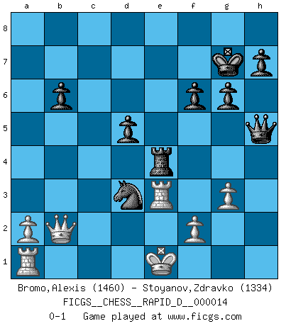 Last move : 0-1 2008 November 12 7:15:39 [Event "FICGS__CHESS__RAPID_D__000014"] [Site "FICGS"] [Date "2008.10.11"] [Round "1"] [White "Bromo,Alexis"] [Black "Stoyanov,Zdravko"] [Result "0-1"] [WhiteElo "1460"] [BlackElo "1334"] 1.d4 c6 2.c4 e6 3.Nf3 d5 4.e3 Nf6 5.Nc3 Bb4 6.Bd2 Bxc3 7.Bxc3 Ne4 8.c5 Nxc3 9.bxc3 O-O 10.Bd3 b6 11.cxb6 axb6 12.Qc2 g6 13.Ne5 Nd7 14.Nxc6 Qc7 15.Ne7+ Kg7 16.Nxc8 Rfxc8 17.Kd2 Ra3 18.Rac1 Rca8 19.Ra1 Qc6 20.e4 e5 21.Rhc1 exd4 22.cxd4 Qd6 23.e5 Qb4+ 24.Ke3 R8a4 25.g3 Qxd4+ 26.Ke2 Nxe5 27.Rd1 Qg4+ 28.Kf1 Qh3+ 29.Ke2 Qxh2 30.Qb2 Qh5+ 31.Ke1 Rxd3 32.Rxd3 f6 33.Ra3 Re4+ 34.Re3 Nd3+ 0-1 Queen's pawn Kingside Castling by player Black (move 9) Player Black won this chess game. Follow this game move after move (download)Chess, like love, like music, has the power to make people happy. (Siegbert Tarrasch) Als ich elf wurde, wurde ich einfach gut. (Robert James Fischer) El Ajedrez lo es todo: arte, ciencia y deporte. (Anatoly Karpov) Les échecs, c'est la lutte contre l'erreur. (Johannes Zukertort) It is not enough to be a good player... you must also play well. (Siegbert Tarrasch)