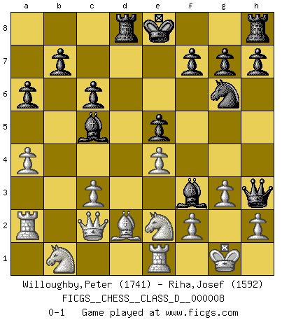 Last move : 0-1 2006 August 16 10:5:20 [Event "FICGS__CHESS__CLASS_D__000008"] [Site "FICGS"] [Date "2006.08.13"] [Round "1"] [White "Willoughby,Peter"] [Black "Riha,Josef"] [Result "0-1"] [WhiteElo "1741"] [BlackElo "1592"] 1.e4 c5 2.Nf3 Nc6 3.Bb5 e6 4.O-O Nge7 5.d4 cxd4 6.Nxd4 Qc7 7.Nc3 a6 8.Bxc6 dxc6 9.g3 e5 10.Nde2 Bh3 11.Re1 Rd8 12.Bd2 Qd7 13.Nb1 Bg4 14.a4 Ng6 15.b4 Bxb4 16.c3 Bc5 17.Ra2 Bf3 18.Qc2 Qh3 0-1 Sicilian : Nimzovich-Rossolimo attack (without ...d6) Kingside Castling by player White (move 4) Player Black won this chess game. Follow this game move after move (download)The essence of Chess is thinking about what Chess is. (David Bronstein) Ich bin stolz ein Bulgare zu sein. (Veselin Topalov) Uno no tiene que jugar muy bien, es suficiente jugar mejor que el oponente. (Siegbert Tarrasch) Une platitude souvent récitée à propos des Echecs est qu'une des choses les plus difficiles à réaliser est de gagner une position gagnante. Cela ne manque pas de sens mais, pour ma part, j'ai toujours trouvé plus difficile de gagner une position perdante. (Tim Krabbe) There are two kinds of tragedy in this world, one is not getting what you want and the other is getting. (Lord of war)