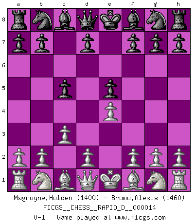 Last move : 0-1 2008 November 21 21:43:16 [Event "FICGS__CHESS__RAPID_D__000014"] [Site "FICGS"] [Date "2008.10.11"] [Round "1"] [White "Magroyne,Holden"] [Black "Bromo,Alexis"] [Result "0-1"] [WhiteElo "1400"] [BlackElo "1460"] 1.e4 c5 2.c3 e5 0-1 This chess game has been lost on time (started : 2008.10.11 7:15:23) Sicilian : Alapin's variation (2.c3) Player Black won this chess game. Follow this game move after move (download)Bobby Fischer is the greatest Chess player who has ever lived. (Ken Smith) Es gibt Leute, die glauben, alles wäre vernünftig, was man mit einem ernsthaften Gesicht tut. (Georg Christoph Lichtenberg) El Ajedrez es tan inspirador que yo no creo que un buen jugador sea capaz de tener un pensamiento malo durante una partida. (Wilhelm Steinitz) Toutes choses étant égales, c'est la conviction qui gagne. Alliée à une volonté de vaincre, elle sert de détonateur, suscite des idées, disperse les doutes et aide à penser clairement. (Robert Fischer) May the force be with you. (Han Solo in Star Wars ep.4)