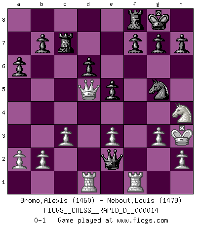 Last move : 0-1 2008 December 18 15:8:3 [Event "FICGS__CHESS__RAPID_D__000014"] [Site "FICGS"] [Date "2008.10.11"] [Round "1"] [White "Bromo,Alexis"] [Black "Nebout,Louis"] [Result "0-1"] [WhiteElo "1460"] [BlackElo "1479"] 1.e4 c5 2.Nf3 d6 3.d4 cxd4 4.Nxd4 Nf6 5.Nc3 a6 6.Be3 Ng4 7.Bc4 Nxe3 8.fxe3 e5 9.Nb3 Be7 10.Nd5 O-O 11.O-O Be6 12.Nxe7+ Qxe7 13.Bxe6 Qxe6 14.Nd2 Nd7 15.Nf3 Nc5 16.Qd5 Qg6 17.Rad1 Nxe4 18.Nh4 Qg4 19.g3 Rac8 20.c3 Rc7 21.Kg2 Qe2+ 22.Kh3 Ng5+ 0-1 Sicilian : Najdorf, Byrne (English) attack Kingside Castling by player Black (move 10) Kingside Castling by player White (move 11) Player Black won this chess game. Follow this game move after move (download)Chess is so inspiring that I do not believe a good player is capable of having an evil thought during the game. (Wilhelm Steinitz) Kombinieren und Schwarzhandel gehören verboten. (Savielly Grigorievitsch Tartakower) El tablero es el mundo, las piezas es el fenomeno del universo, las reglas del juego son lo que llamamos leyes de la naturaleza y el jugador del lado opuesto, se encuentra oculto a nuestra vista. (Thomas Huxley) Un millionnaire : 'Monsieur Steinitz ! Vous ne participez aux tournois que pour l'argent, alors que moi je n'y viens que pour l'honneur.' Steinitz : 'Chacun joue pour ce qu'il n'a pas'... If you work for a living, why do you kill yourself working ? (Tuco to a chicken in The Good, The Bad and The Ugly)