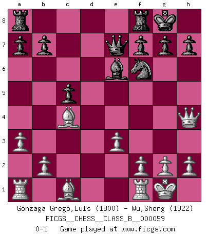 Last move : 0-1 2008 November 7 21:42:5 [Event "FICGS__CHESS__CLASS_B__000059"] [Site "FICGS"] [Date "2008.10.12"] [Round "1"] [White "Gonzaga Grego,Luis"] [Black "Wu,Sheng"] [Result "0-1"] [WhiteElo "1800"] [BlackElo "1922"] 1.c4 Nf6 2.Nc3 e5 3.Nf3 Nc6 4.e3 Bb4 5.Qc2 Bxc3 6.Qxc3 Qe7 7.a3 d5 8.d4 Nxd4 9.Nxd4 exd4 10.Qxd4 c5 11.Qh4 dxc4 12.Bxc4 O-O 13.O-O Be6 0-1 English Opening Kingside Castling by player Black (move 12) Kingside Castling by player White (move 13) Player Black won this chess game. Follow this game move after move (download)Not only will I predict his triumph over Botvinnik, but I'll go further and say that he'll probably be the greatest Chess player that ever lived. (John Collins) Wer der Ansicht ist, daß alle Schachspieler verrückt sind, wird durch Studium des Lebens von Emil Josef Diemer nicht auf andere Gedanken kommen. (Hans Ree) El Ajedrez es parte de una cultura y si una cultura esta en decadencia, entonces también el Ajedrez declinará. (Mikhail Botvinnik) Aux échecs, l'amour-propre est satisfait quand on remporte la victoire, mais il n'y a pas de honte à être battu. (Benjamin Franklin) God is an atheist. (Unknown)