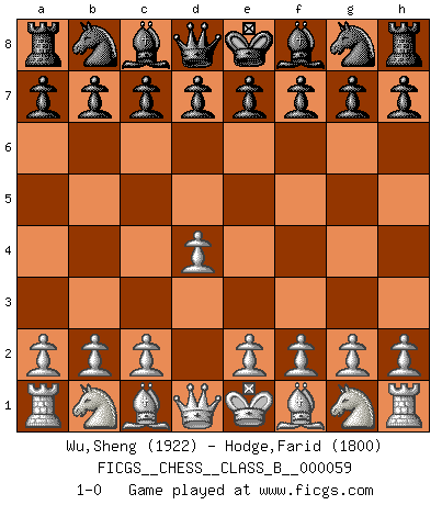 Last move : 1-0 2008 November 29 10:28:57 [Event "FICGS__CHESS__CLASS_B__000059"] [Site "FICGS"] [Date "2008.10.12"] [Round "1"] [White "Wu,Sheng"] [Black "Hodge,Farid"] [Result "1-0"] [WhiteElo "1922"] [BlackElo "1800"] 1.d4 1-0 This chess game has been lost on time (started : 2008.10.12 21:43:11) Queen's pawn Player White won this chess game. Follow this game move after move (download)All that matters on the Chessboard is good moves. (Bobby Fischer) Viele Opfer benötigen überhaupt keine konkrete Berechnung. Es genügt sich die entstehende Position kurz vorzustellen, um uns davon zu überzeugen, dass das Opfer korrekt ist. (Mikhail Nekhemyevich Tal) El Ajedrez es un mar en el cual un mosquito puede beber y un elefante puede bañarse. (Refrán Hindú) Il n'y a pas eu de défaite parce que je ne crois pas que cet ordinateur ait jamais existé. IBM a triché en refusant d'imprimer les modes de recherche de la machine. C'est évident, pendant le match, des coups décisifs ont été joués par des êtres humains. Aujourd'hui, les meilleurs spécialistes en informatique ne peuvent toujours pas expliquer comment Deep-Blue a pu jouer contre la logique des ordinateurs. IBM a gagné une guerre de communication, mais ils sont incapables de prouver que l'ordinateur a gagné tout seul. (Garry Kasparov) Games, world of games... There's always an opponent, and there's always a victim. (Revolver, movie)