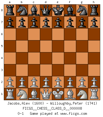 Last move : 0-1 2006 September 22 20:47:39 [Event "FICGS__CHESS__CLASS_D__000008"] [Site "FICGS"] [Date "2006.08.13"] [Round "1"] [White "Jacobs,Alex"] [Black "Willoughby,Peter"] [Result "0-1"] [WhiteElo "1600"] [BlackElo "1741"] 0-1 This chess game has been lost on time (started : 2006.08.13 19:48:43) Player Black won this chess game. Follow this game move after move (download)Mistrust is the most necessary characteristic of the Chess player. (Siegbert Tarrasch) Die Arbeit ist etwas Unnatürliches. Die Faulheit allein ist göttlich. (Anatole France) Un jugador que es sorprendido, esta derrotado a medias. (Proverbio) Tout change constamment, y compris dans le monde des Echecs. (Botvinnik) The good fighters of old first put themselves beyond the possibility of defeat, and then waited for an opportunity of defeating the enemy. (Sun Tzu)