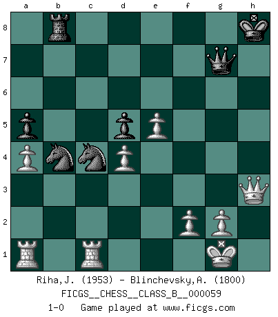 Last move : 1-0 2008 October 29 23:51:31 [Event "FICGS__CHESS__CLASS_B__000059"] [Site "FICGS"] [Date "2008.10.12"] [Round "1"] [White "Riha,Josef"] [Black "Blinchevsky,Alexander"] [Result "1-0"] [WhiteElo "1953"] [BlackElo "1800"] 1.e4 e6 2.d4 d5 3.Nd2 Nf6 4.e5 Nfd7 5.Bd3 c5 6.c3 Nc6 7.Ne2 a5 8.O-O cxd4 9.cxd4 Nb6 10.Nf3 Be7 11.Nf4 Nb4 12.Bb1 g6 13.a4 Bd7 14.b3 Nc8 15.Nd3 O-O 16.Bh6 Re8 17.Nc5 b6 18.Nxd7 Qxd7 19.h4 b5 20.h5 bxa4 21.bxa4 Nb6 22.Ng5 Bxg5 23.Bxg5 Nc4 24.Qf3 Nc6 25.Rd1 Ra7 26.Qf6 Qe7 27.Qf4 Qf8 28.Bh6 Qe7 29.Qg3 Rb8 30.hxg6 fxg6 31.Bxg6 hxg6 32.Qxg6+ Kh8 33.Bg5 Qh7 34.Qxe6 Rg7 35.Bf6 Nb4 36.Rdc1 Qg6 37.Qh3+ Qh7 38.Qd7 Qg6 39.Bxg7+ Qxg7 40.Qh3+ 1-0 French : Tarrasch, Closed variation Kingside Castling by player White (move 8) Kingside Castling by player Black (move 15) Player White won this chess game. Follow this game move after move (download)Methodical thinking is of more use in Chess than inspiration. (C. J. S. Purdy) Schon mancher Spieler hat aufgegeben, um zu vermeiden, daß er eine Figur verliert. (Savielly Grigorievitsch Tartakower) El jugador táctico sabe que hacer cuando hay algo que hacer; mientras que el estratega sabe que hacer cuando no hay nada que hacer. (Gerald Abrahams) 'L'échange des dames est un coup dur pour les deux adversaires...' Un journaliste lors d'une partie du match Spassky-Fischer I would love to change the world, but they won't give me the source code. (Unknown)